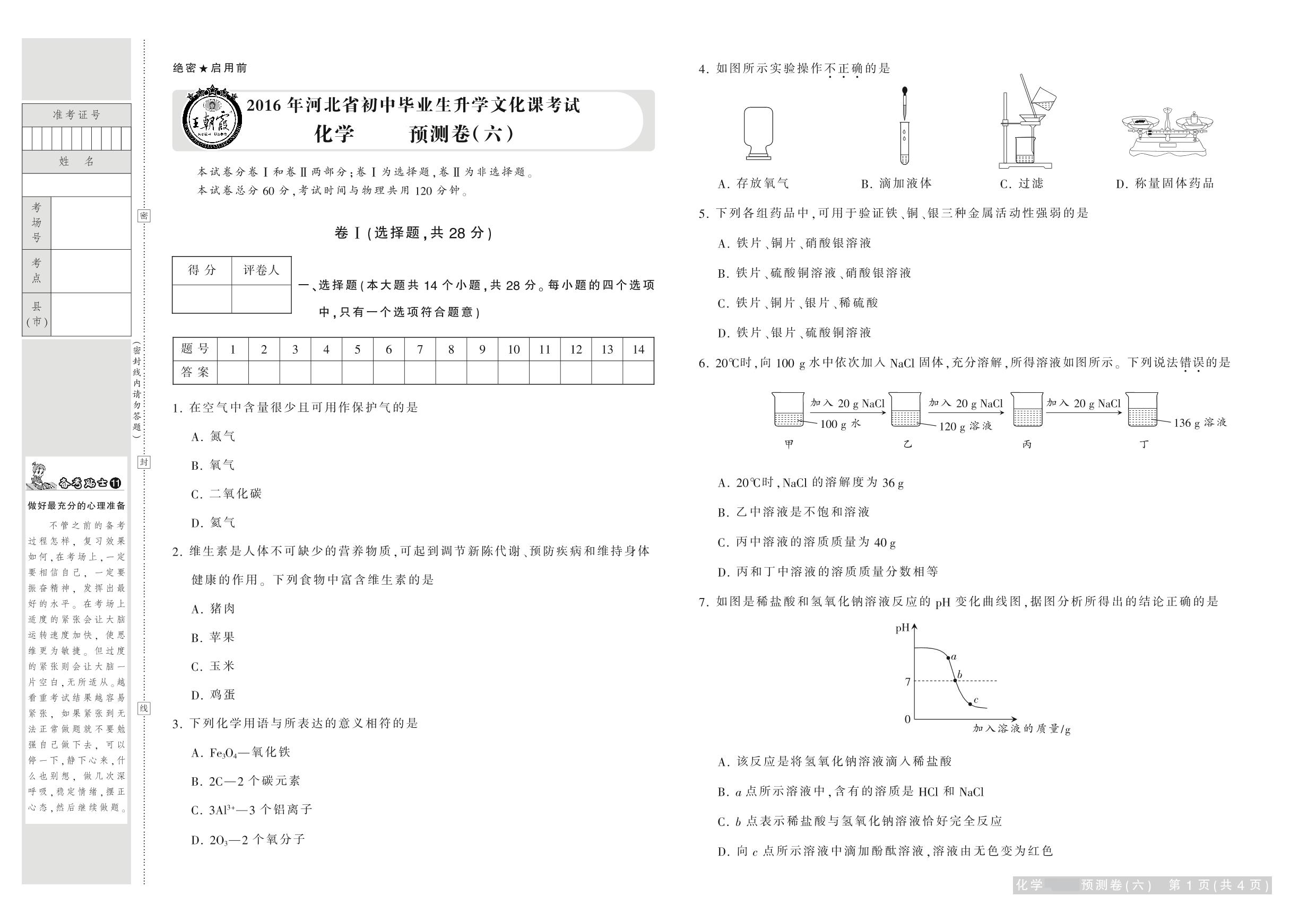2016年河北省普通高中招生考试试卷化学·预测卷(六)
