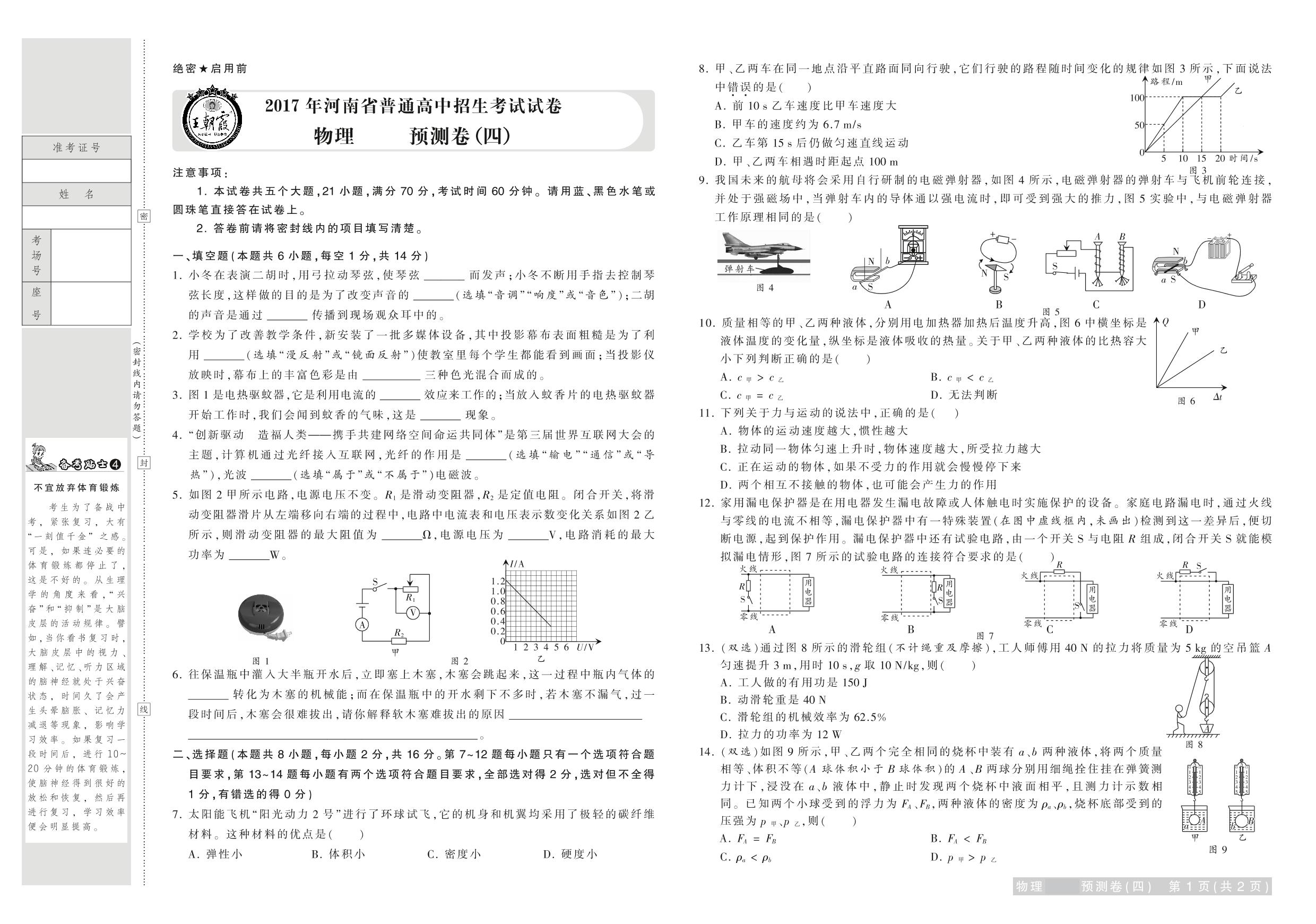 2017年河南省普通高中招生考试试卷物理·预测卷(四)