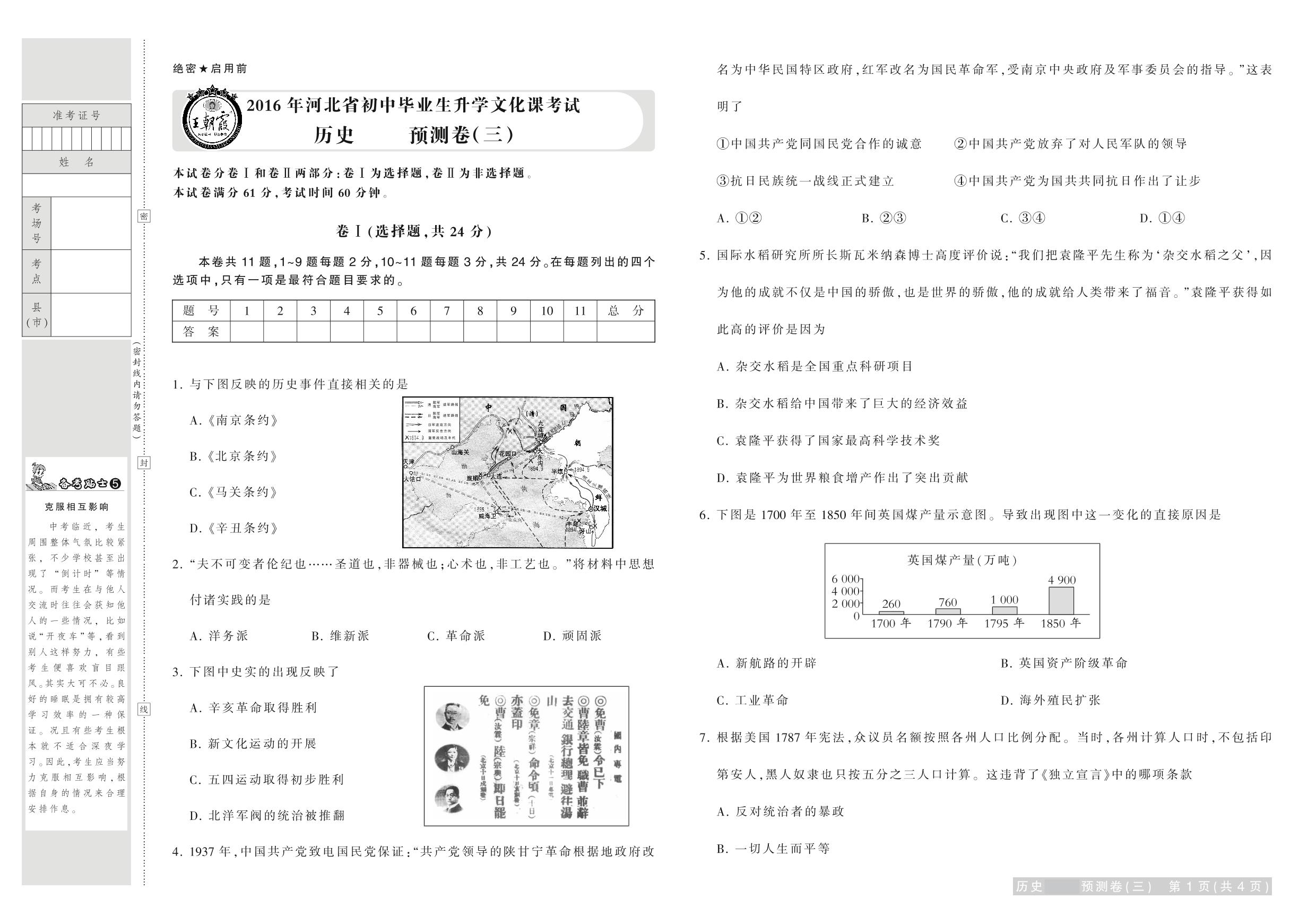 2016年河北省普通高中招生考试试卷历史·预测卷(三)