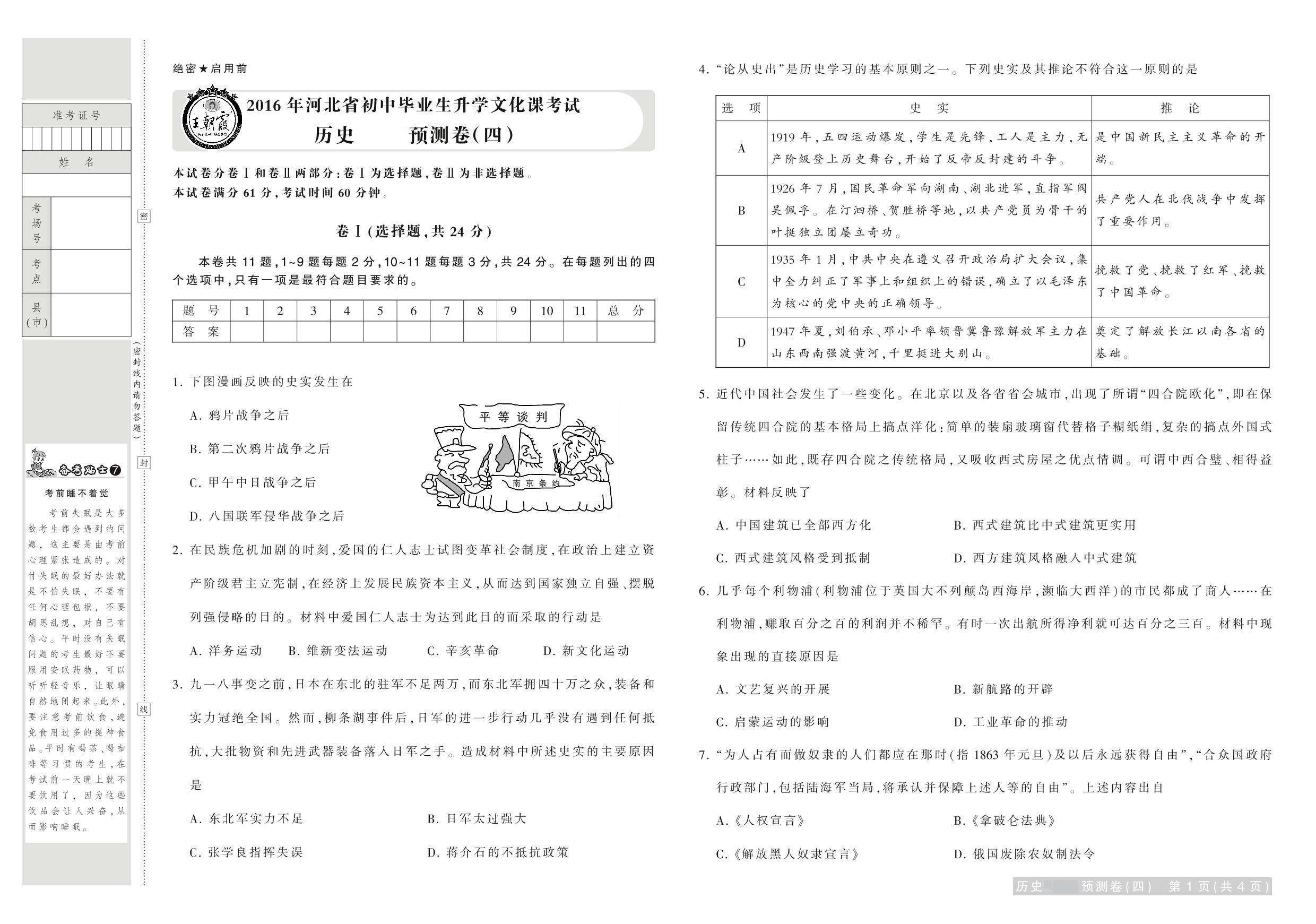 2016年河北省普通高中招生考试试卷历史·预测卷(四)