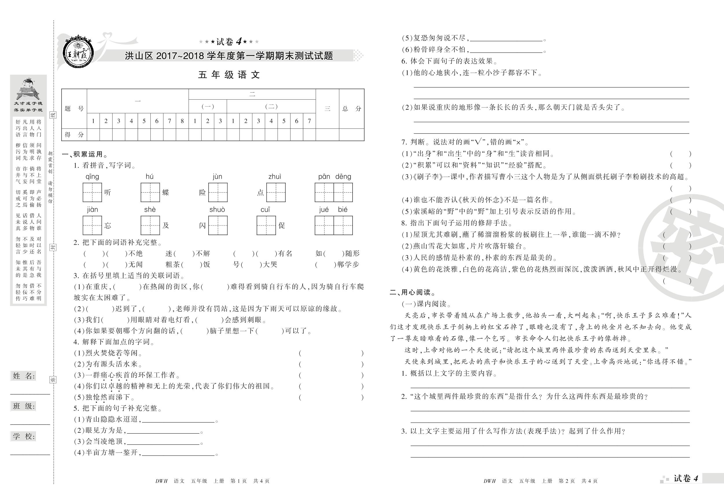 2017-2018学年第一学期武汉市洪山区五年级语文试卷(鄂教版)【4】