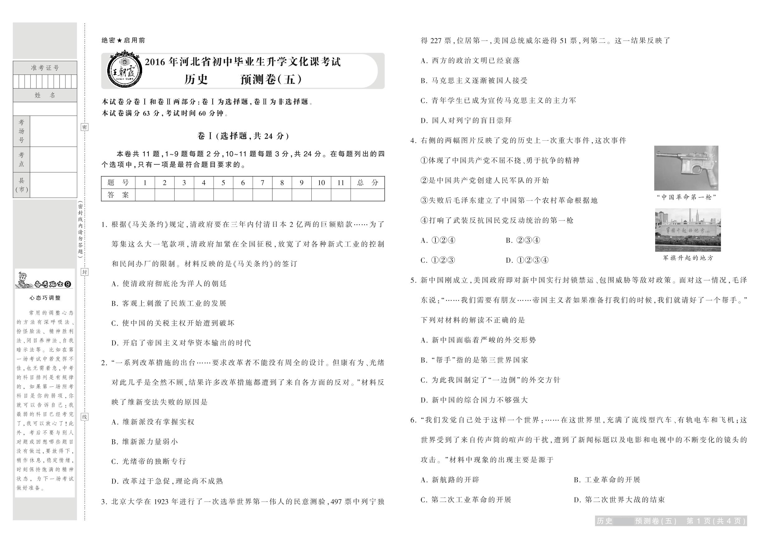 2016年河北省普通高中招生考试试卷历史·预测卷(五)