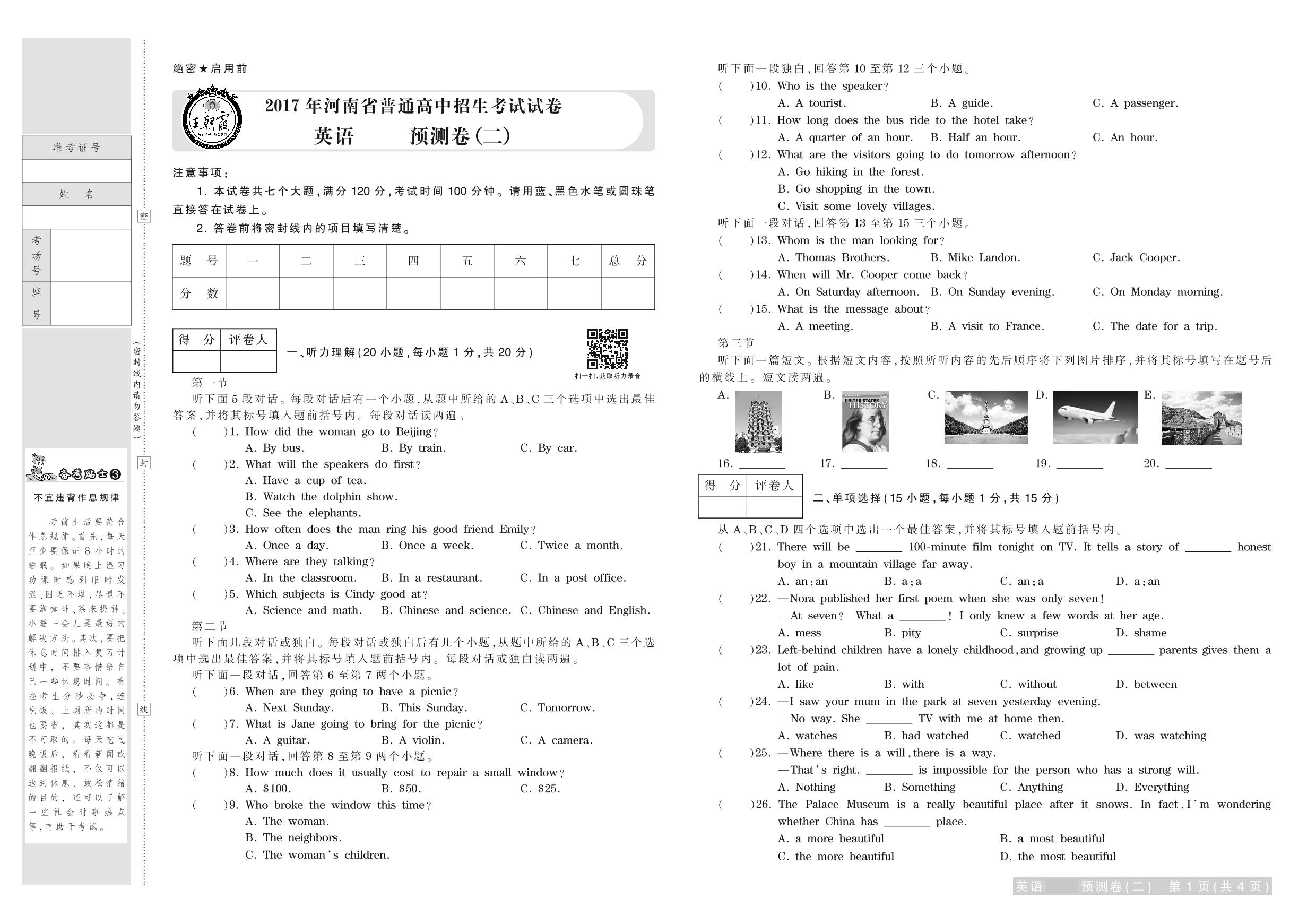 2017年河南省普通高中招生考试试卷英语·预测卷(二)