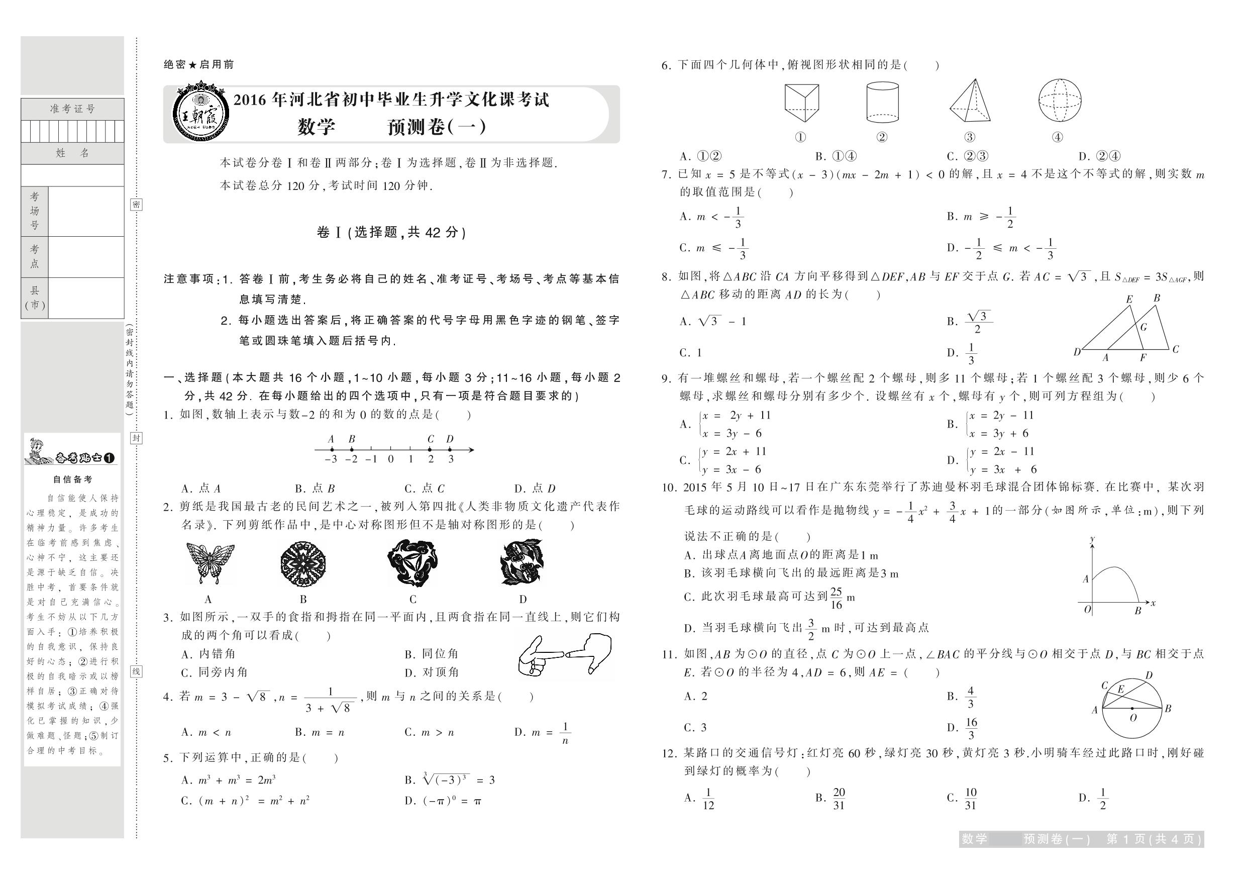 2016年河北省普通高中招生考试试卷数学·预测卷(一)