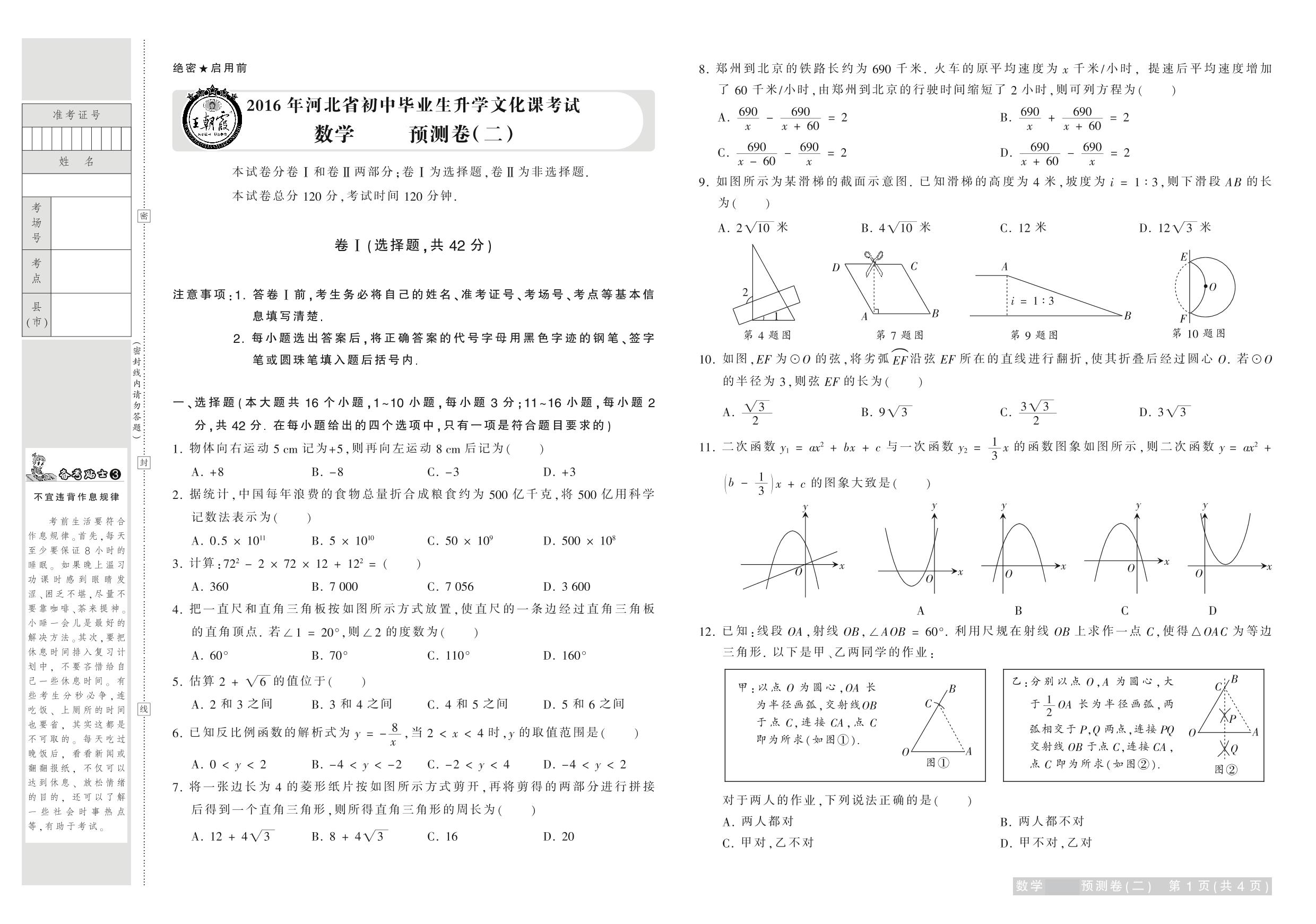 2016年河北省普通高中招生考试试卷数学·预测卷(二)