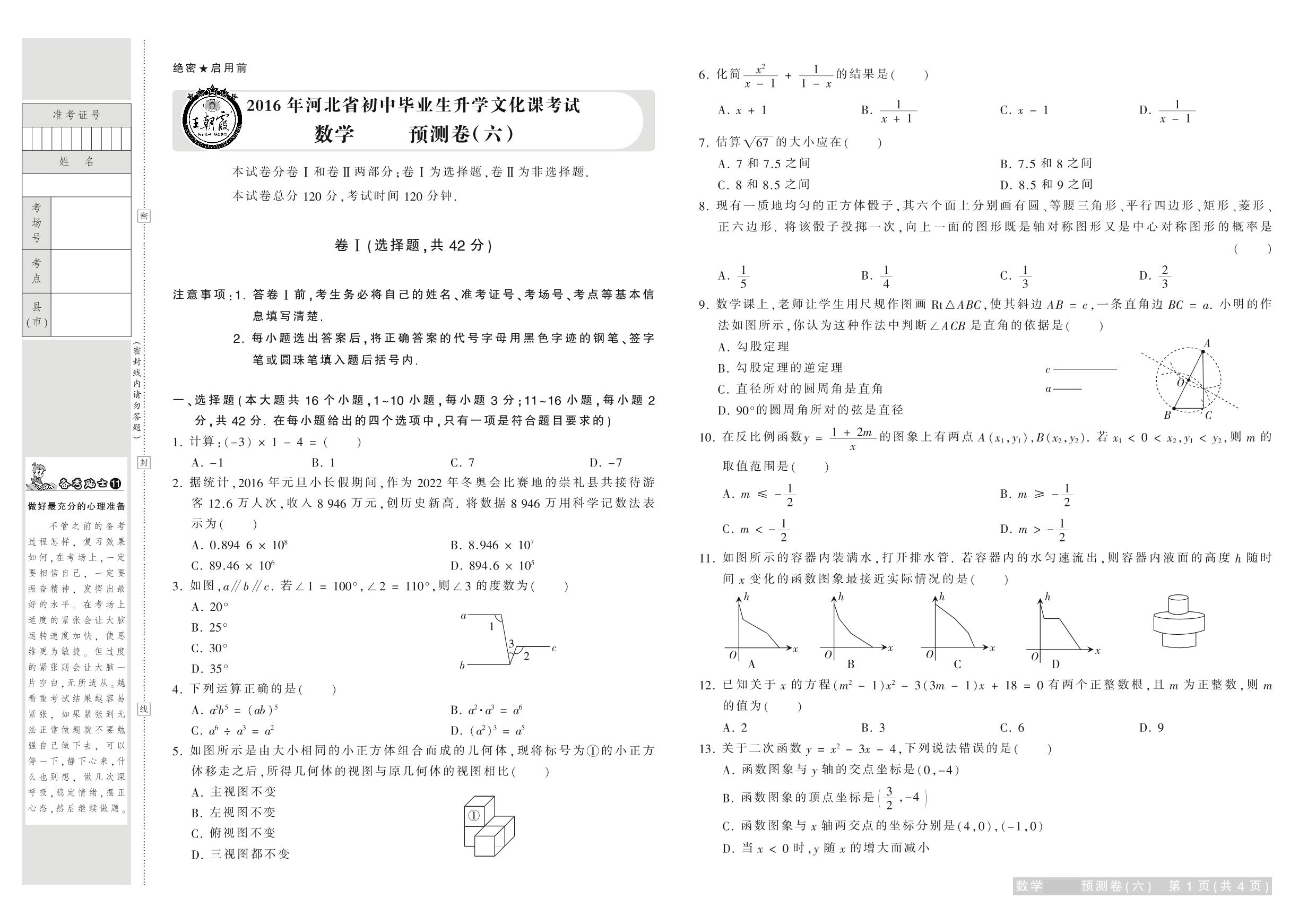 2016年河北省普通高中招生考试试卷数学·预测卷(六)