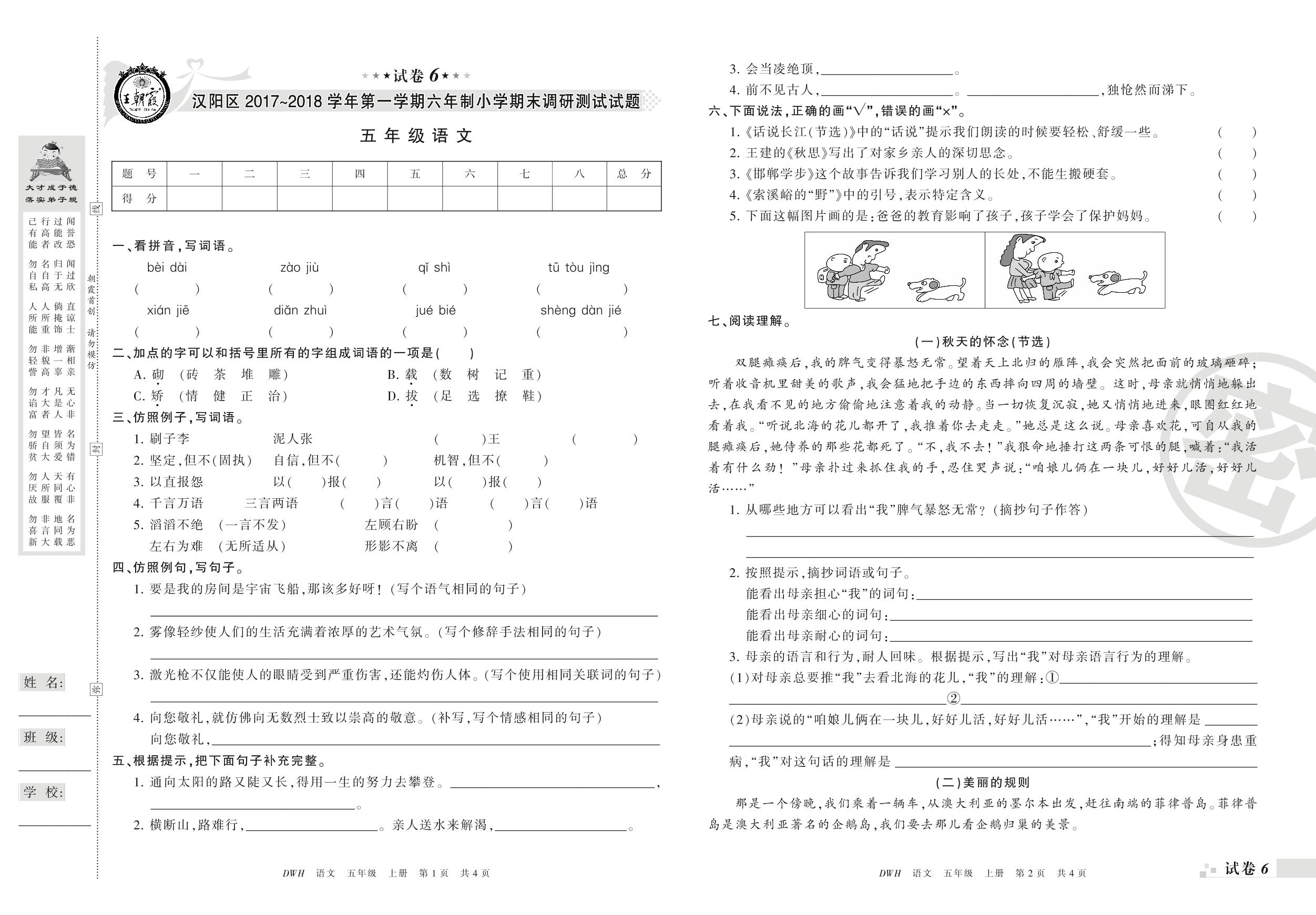 2017-2018学年第一学期武汉市汉阳区五年级语文试卷(鄂教版)【6】