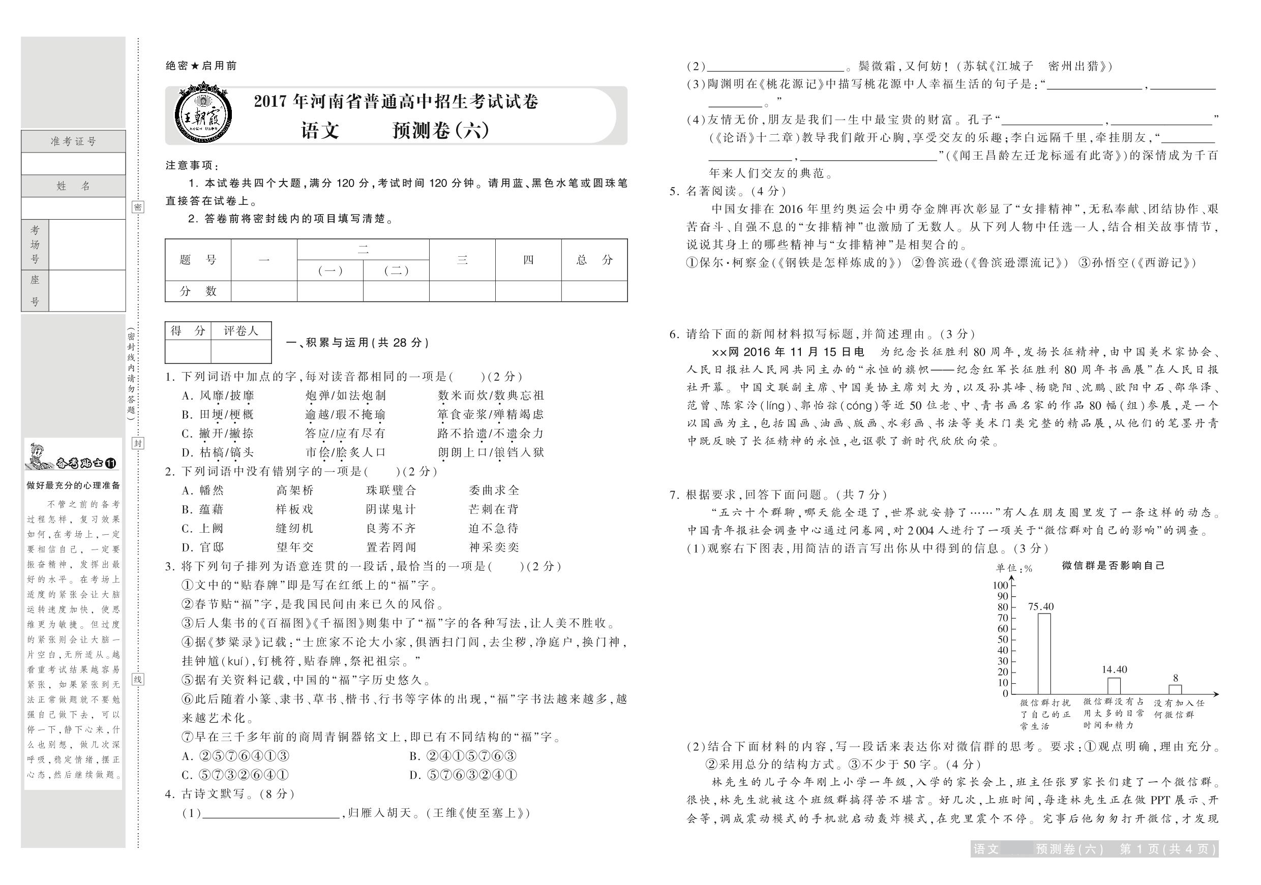 2017年河南省普通高中招生考试试卷语文·预测卷(六)