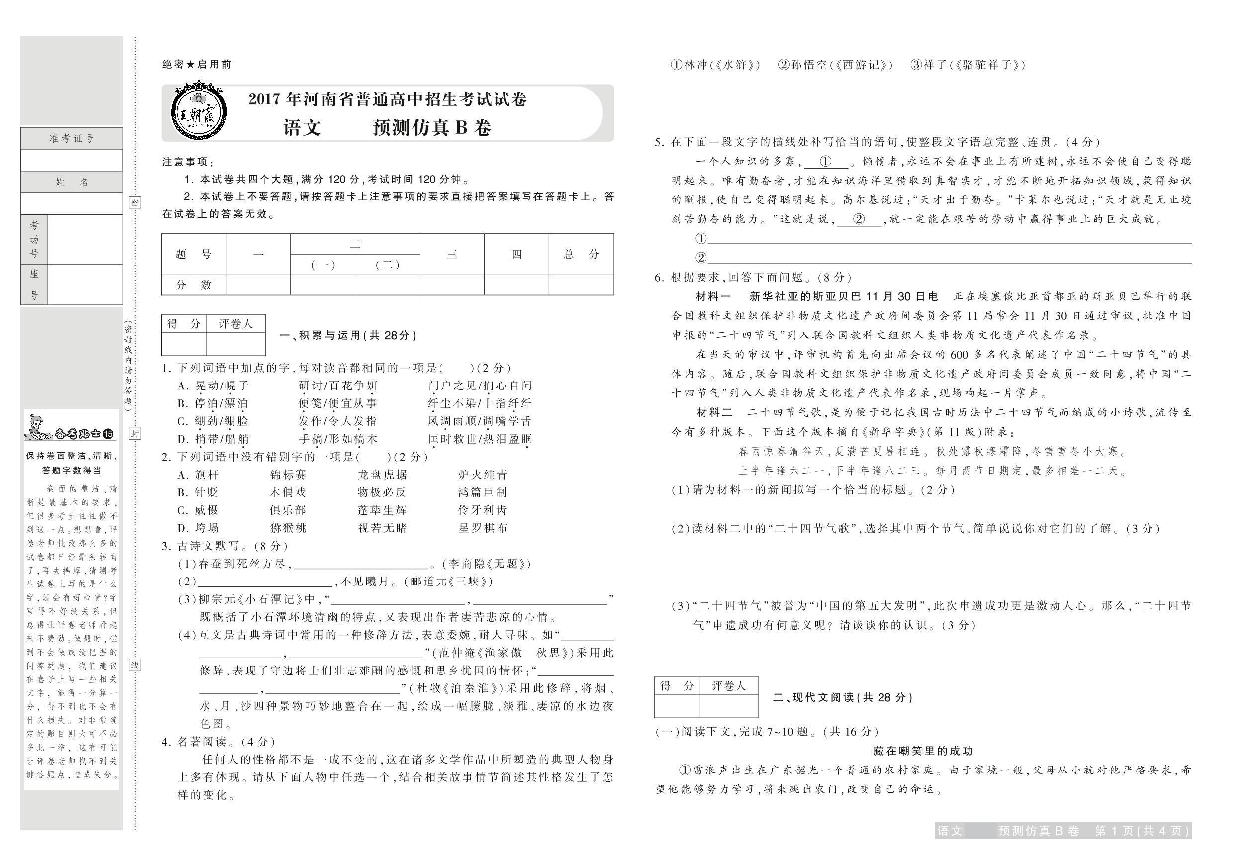 2017年河南省普通高中招生考试试卷语文·预测仿真B卷