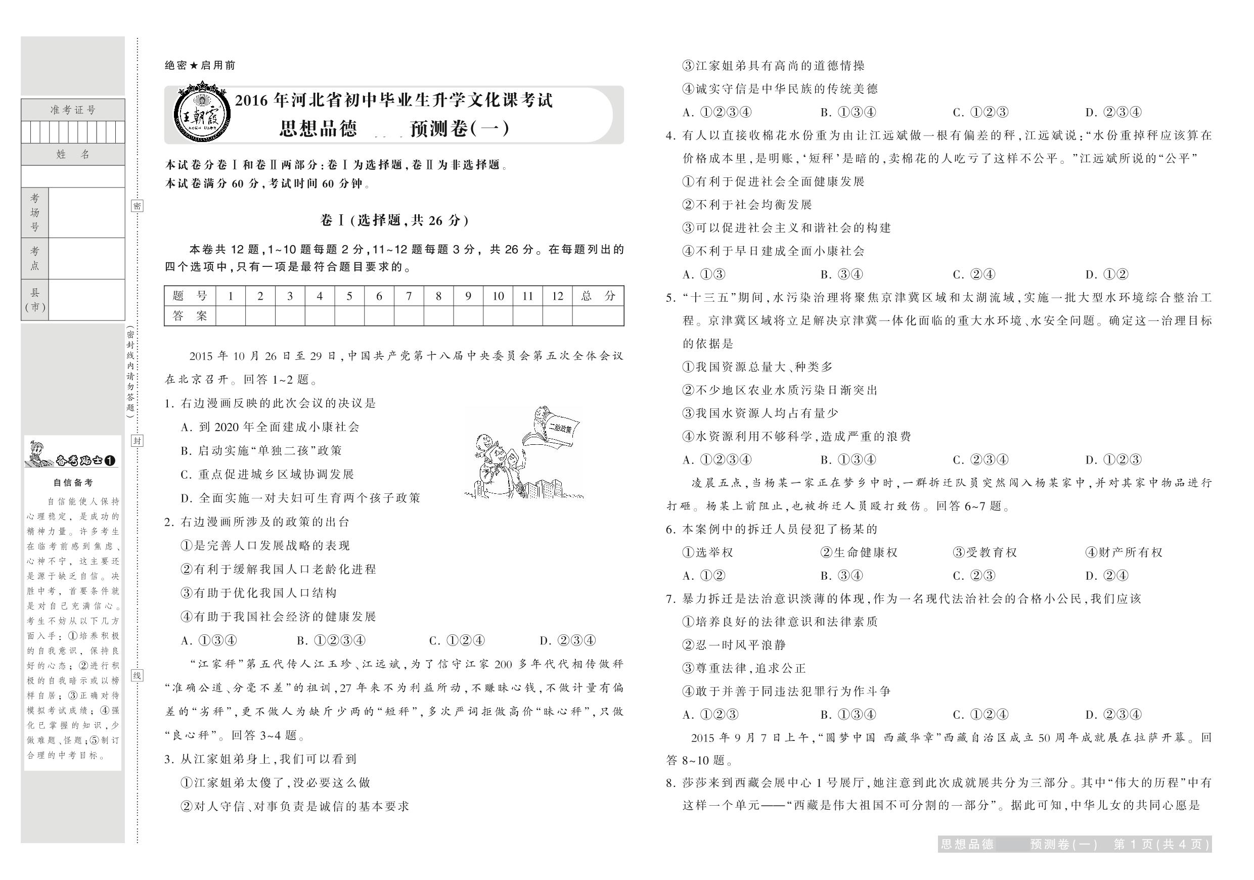 2016年河北省普通高中招生考试试卷道德与法治·预测卷(一)