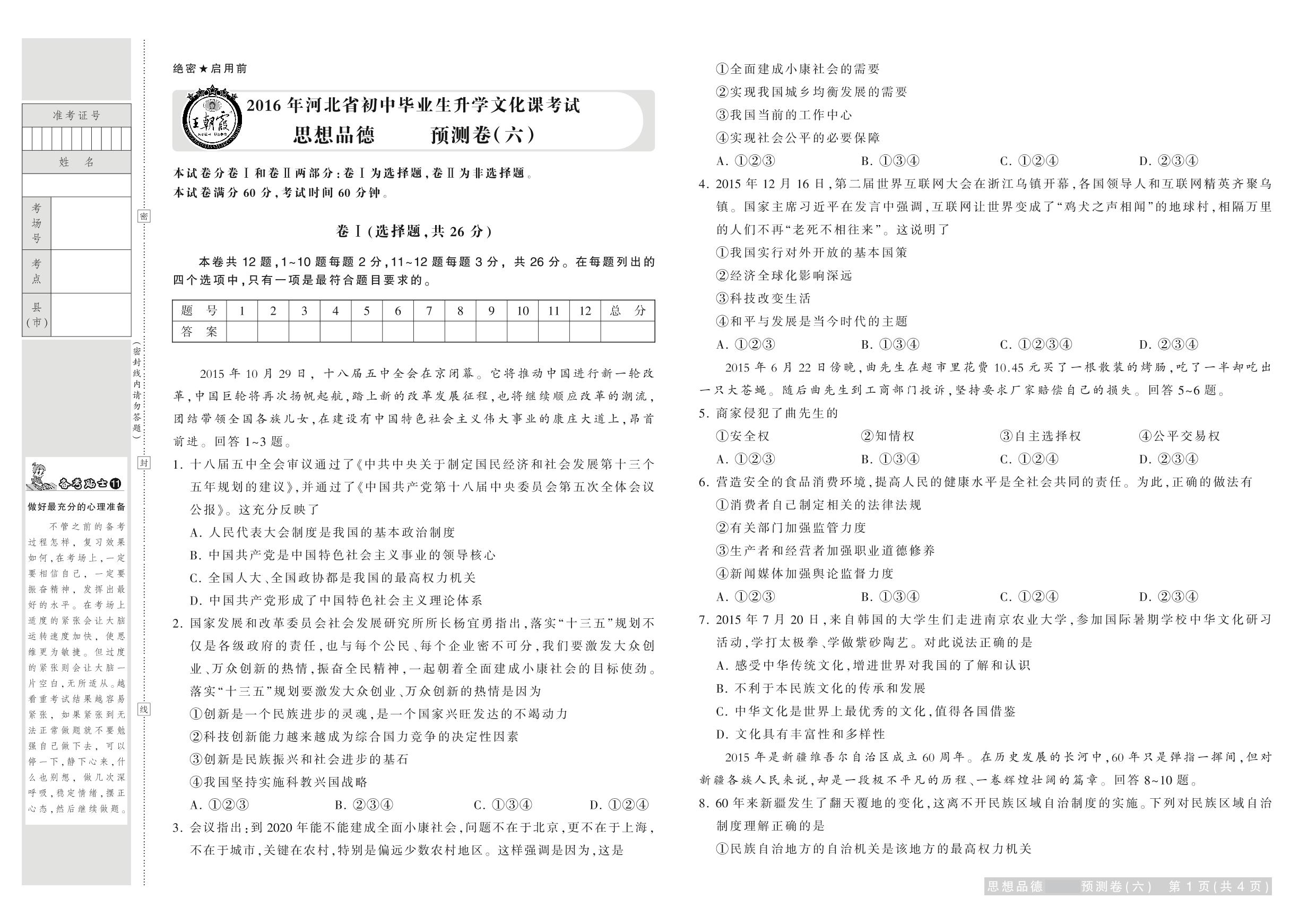 2016年河北省普通高中招生考试试卷道德与法治·预测卷(六)