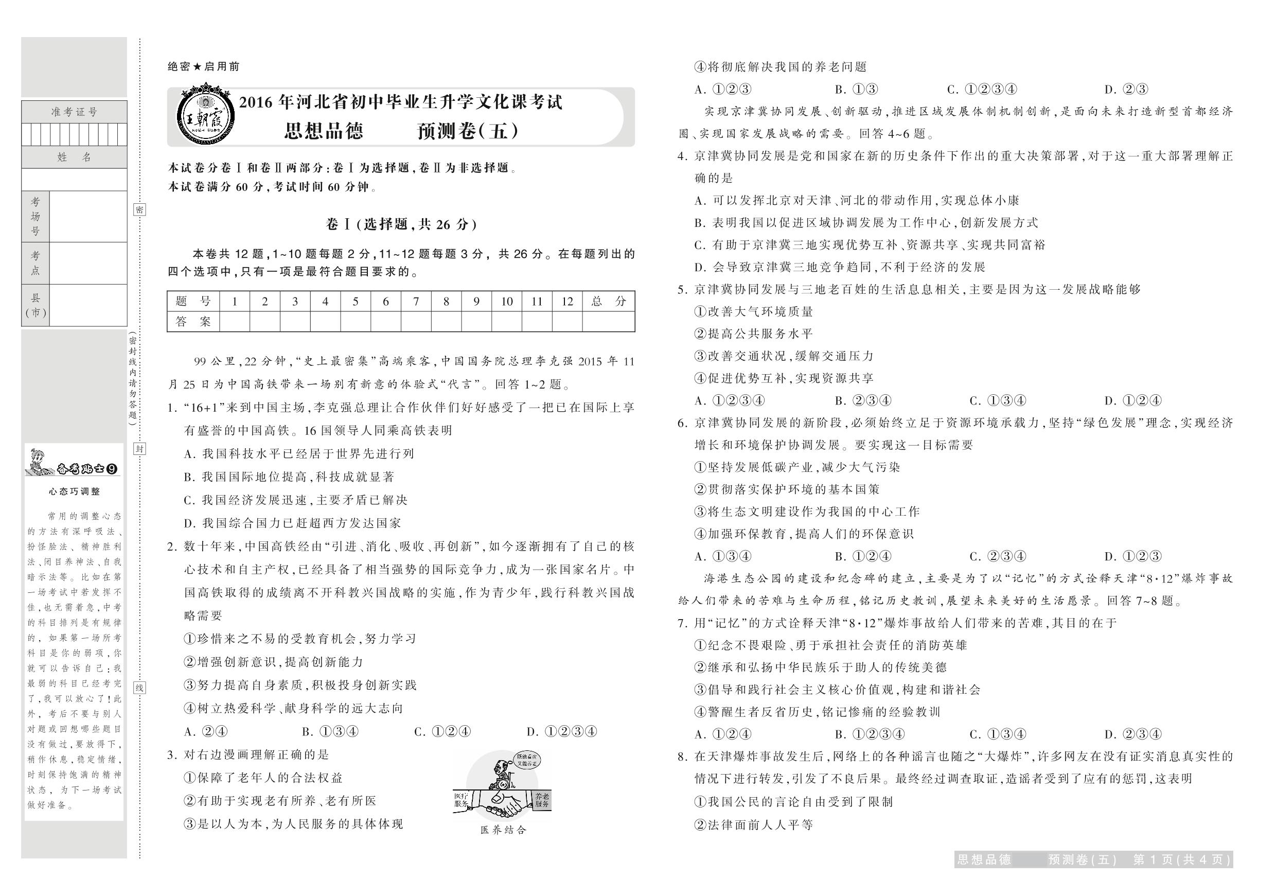 2016年河北省普通高中招生考试试卷道德与法治·预测卷(五)
