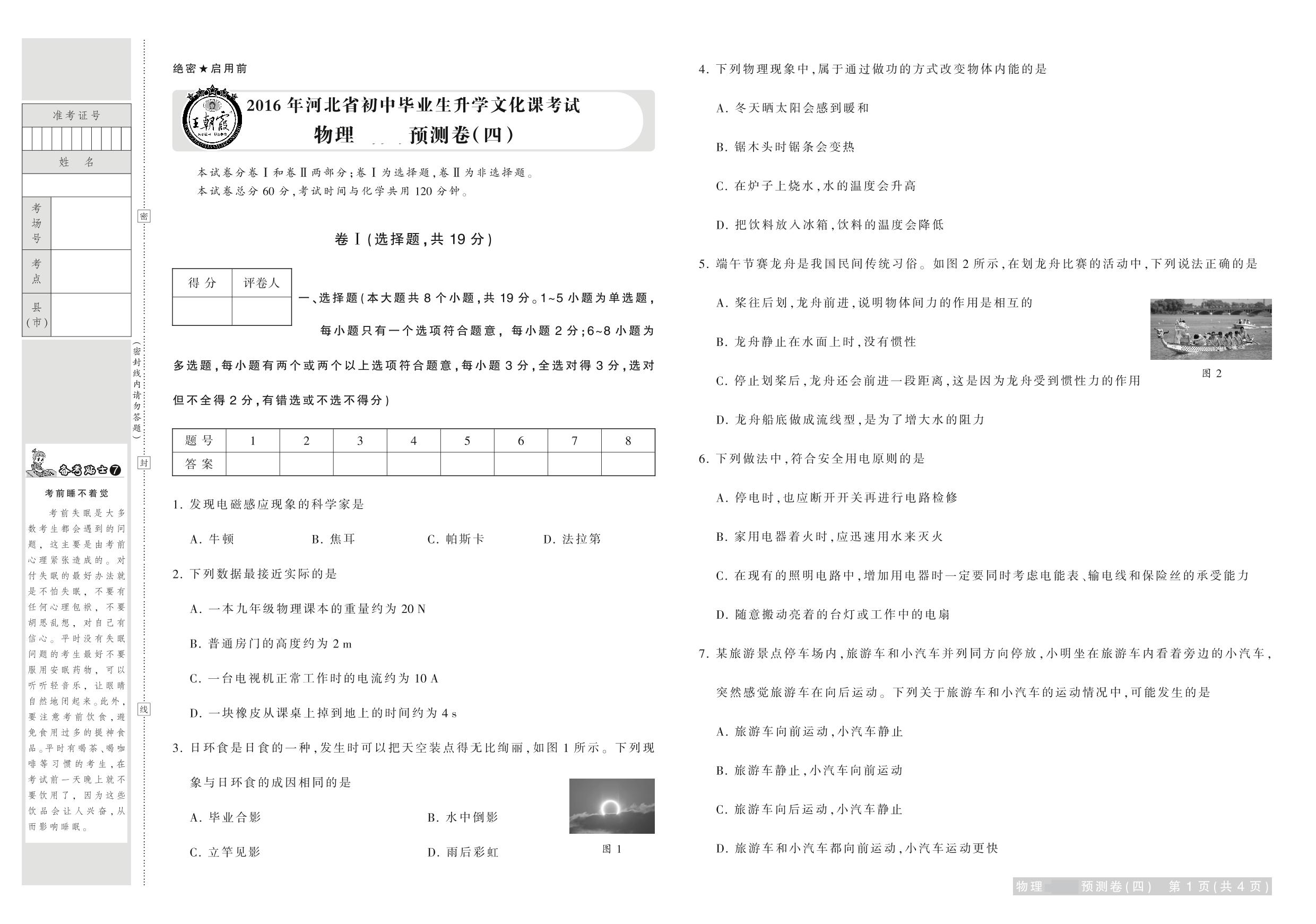 2016年河北省普通高中招生考试试卷物理·预测卷(四)