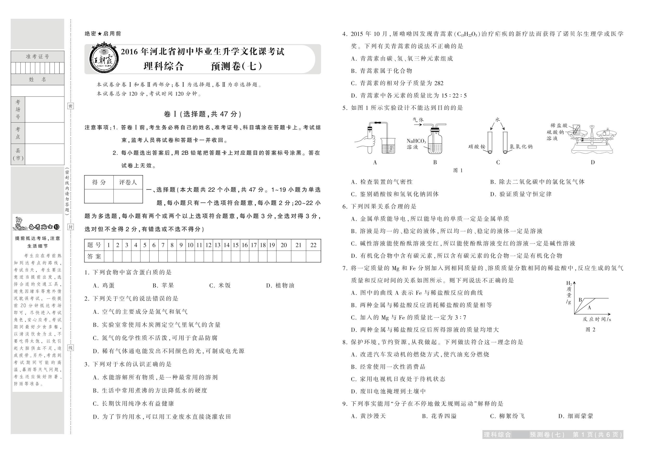 2016年河北省普通高中招生考试试卷物理·预测卷(七)