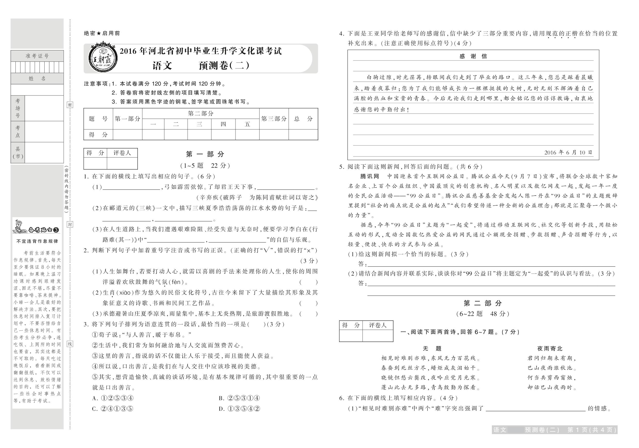 2016年河北省普通高中招生考试试卷语文·预测卷(二)