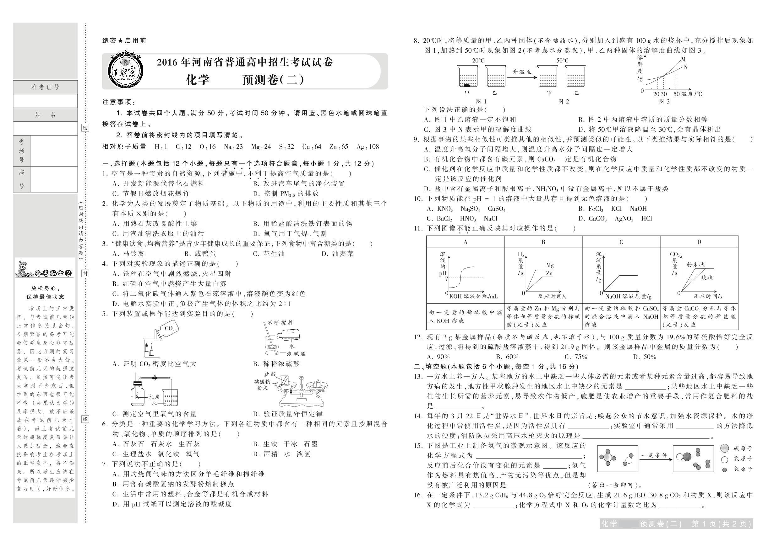 2016年河南省普通高中招生考试试卷化学·预测卷(二)