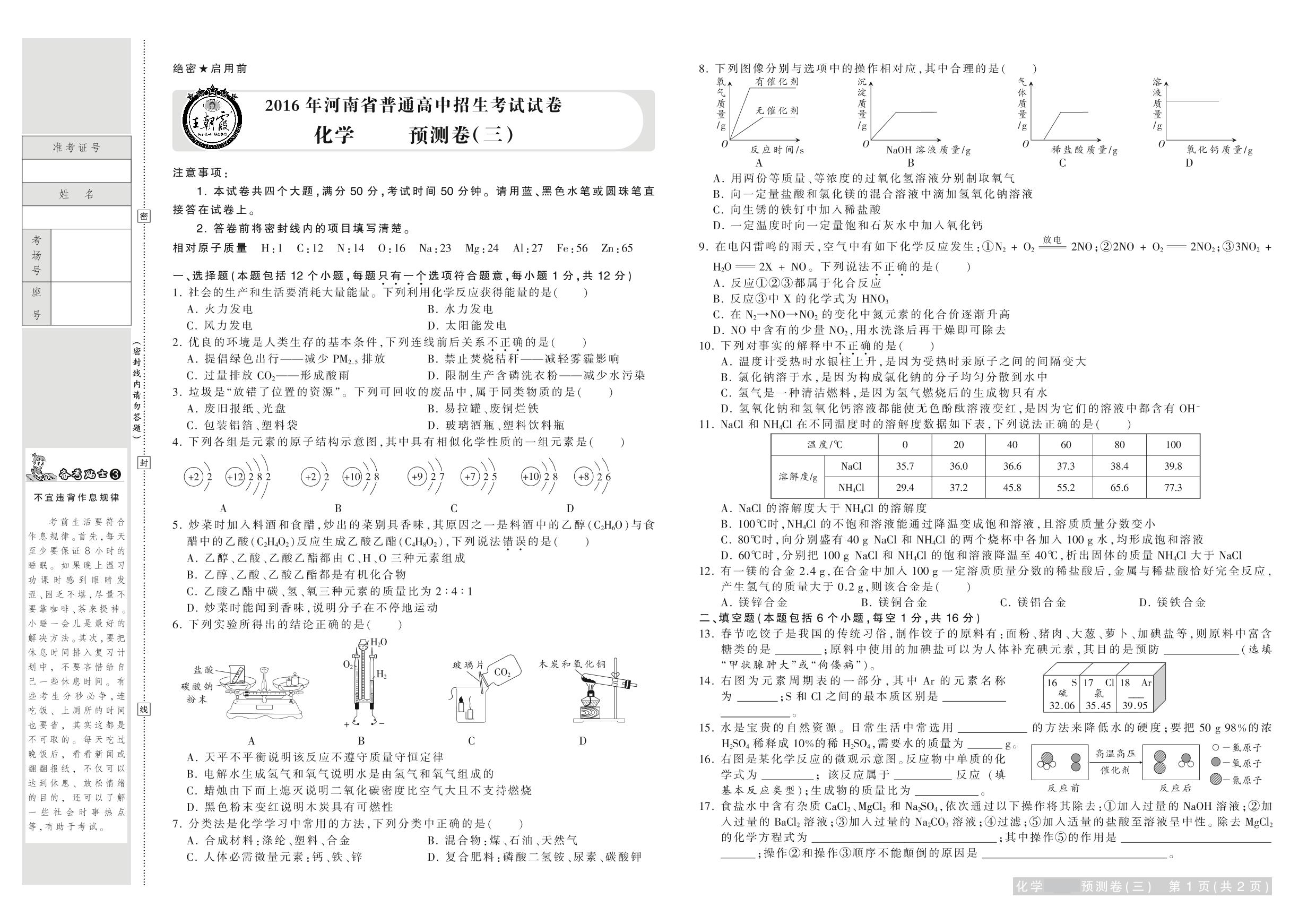 2016年河南省普通高中招生考试试卷化学·预测卷(三)