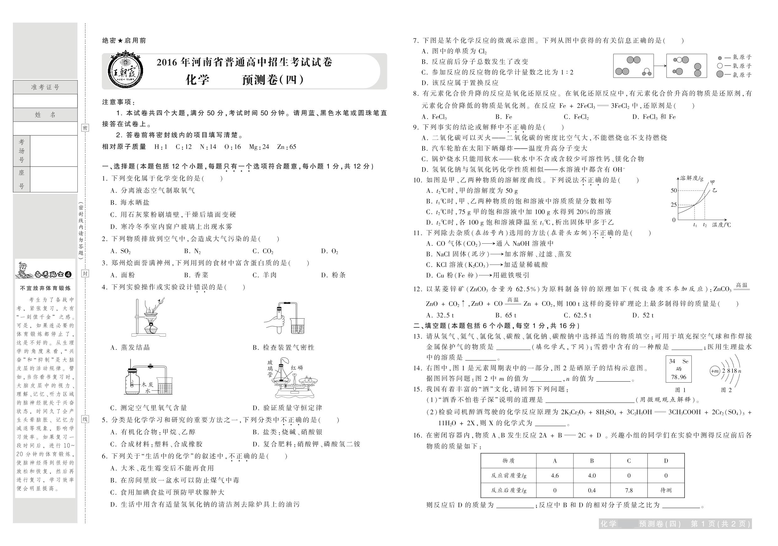 2016年河南省普通高中招生考试试卷化学·预测卷(四)