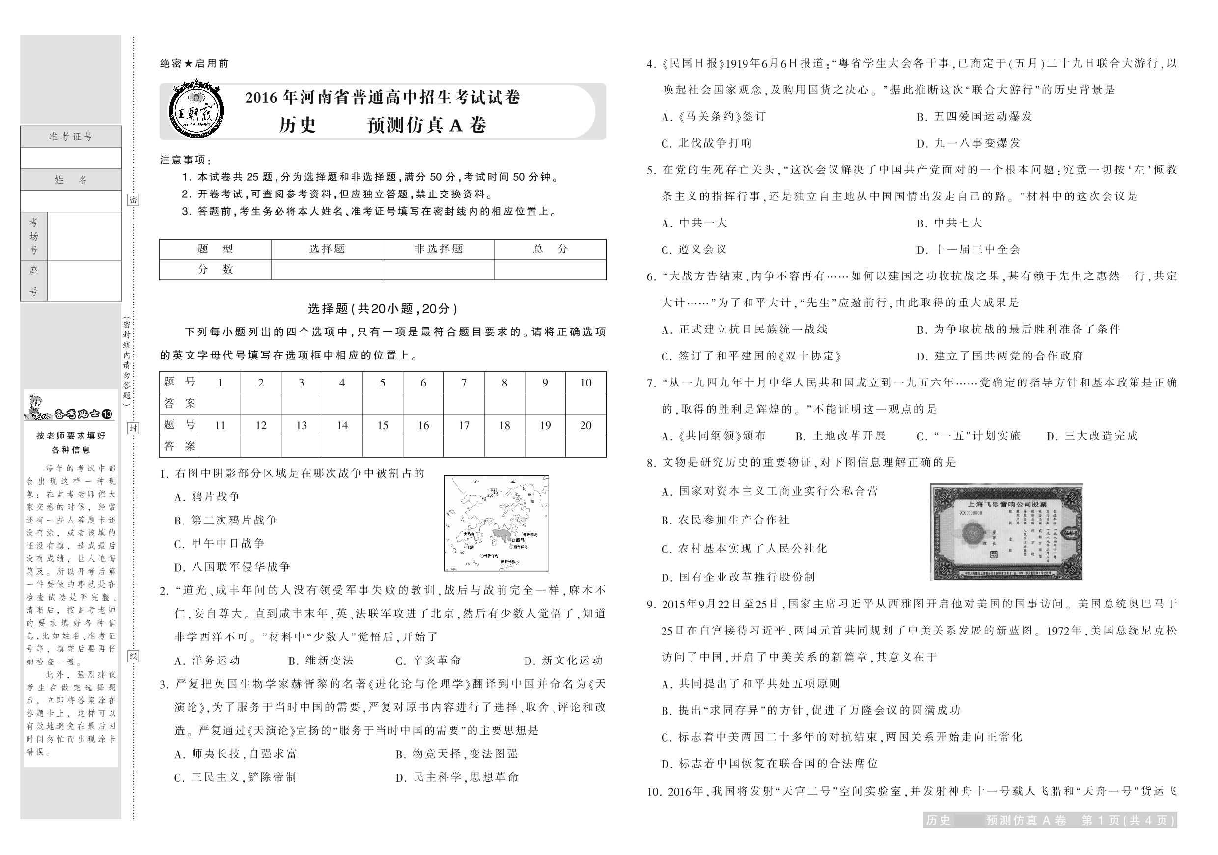 2016年河南省普通高中招生考试试卷历史·预测仿真A卷