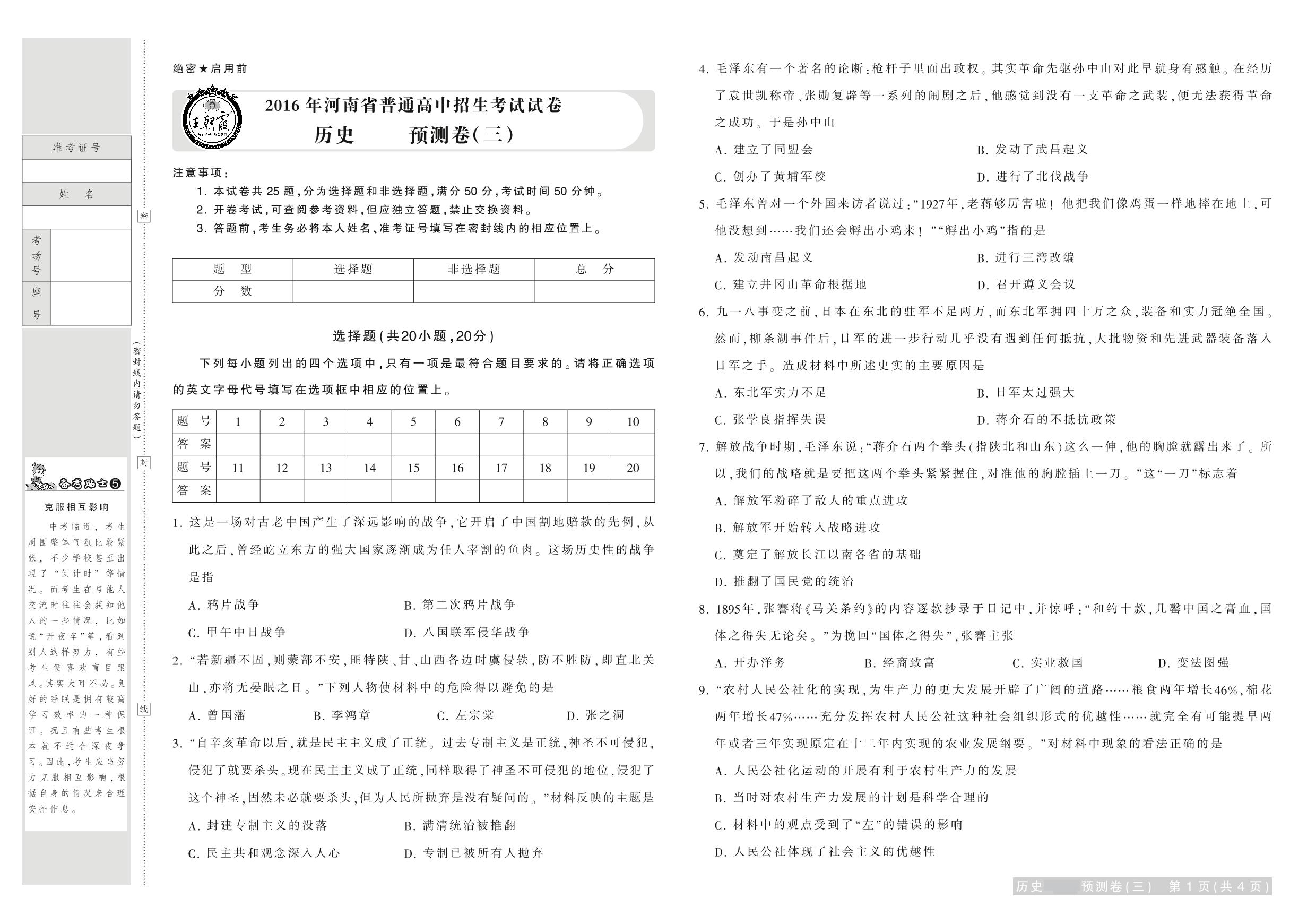 2016年河南省普通高中招生考试试卷历史·预测卷(三)