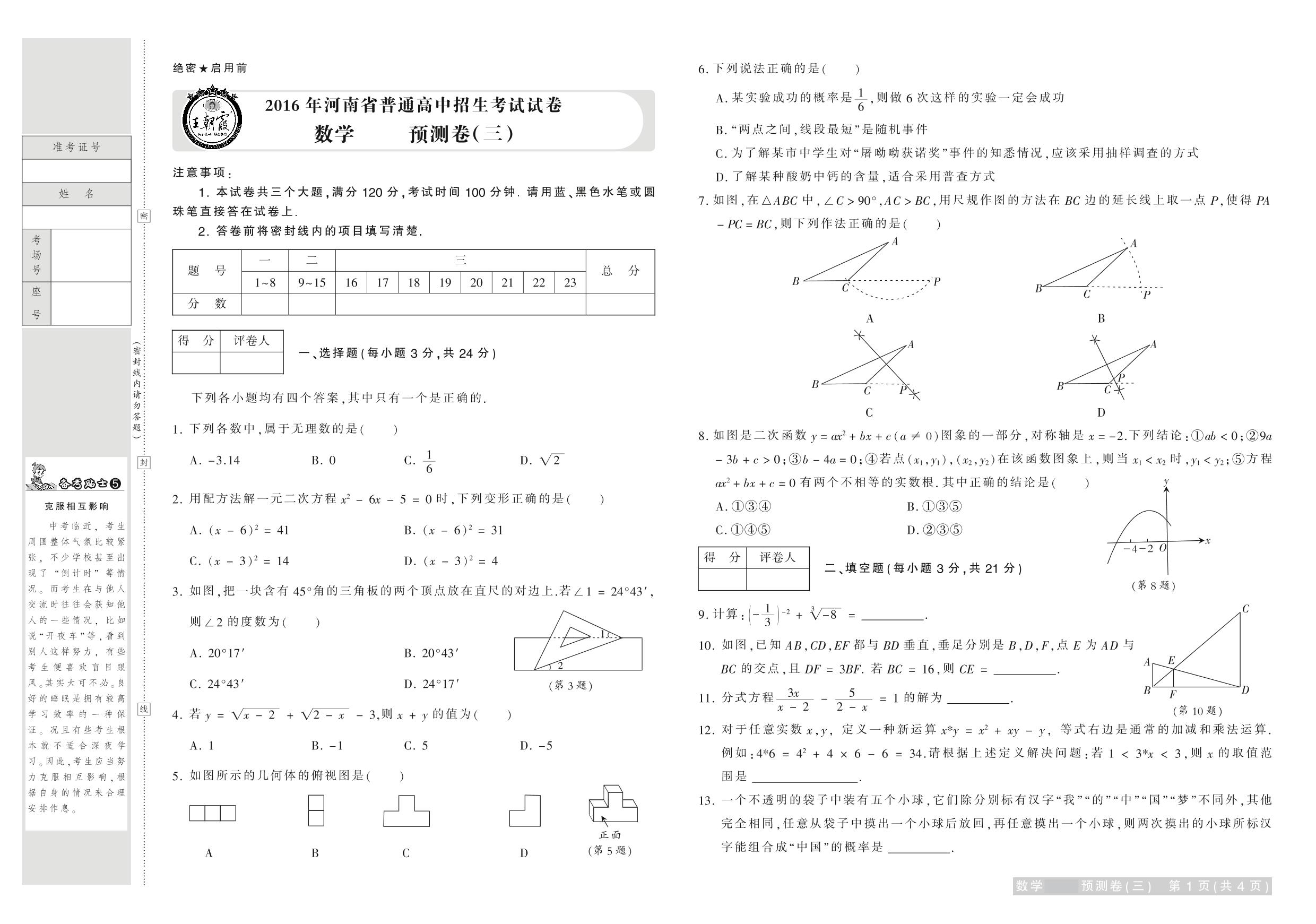 2016年河南省普通高中招生考试试卷数学·预测卷(三)