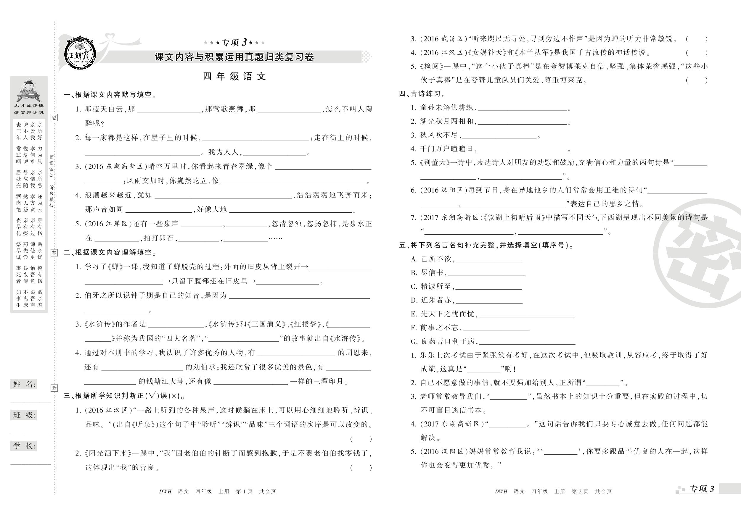 王朝霞期末专项卷——课文内容与积累运用、课内阅读与写作真题归类复习四年级上册语文(鄂教版)【0】