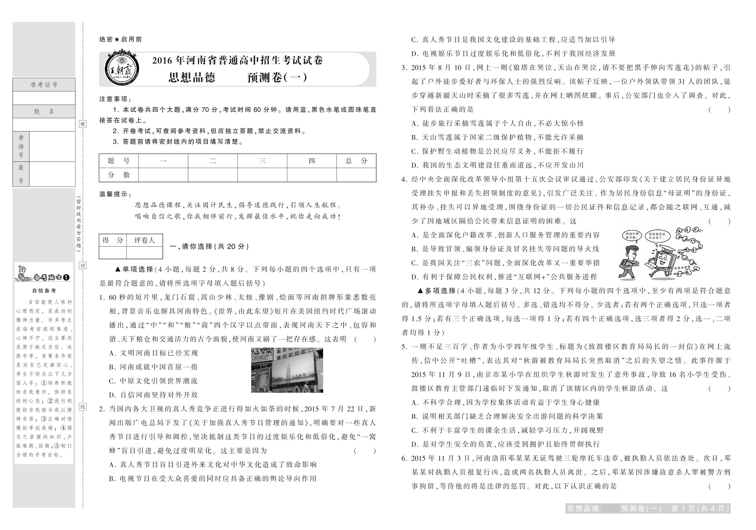2016年河南省普通高中招生考试试卷思想品德·预测卷(一)