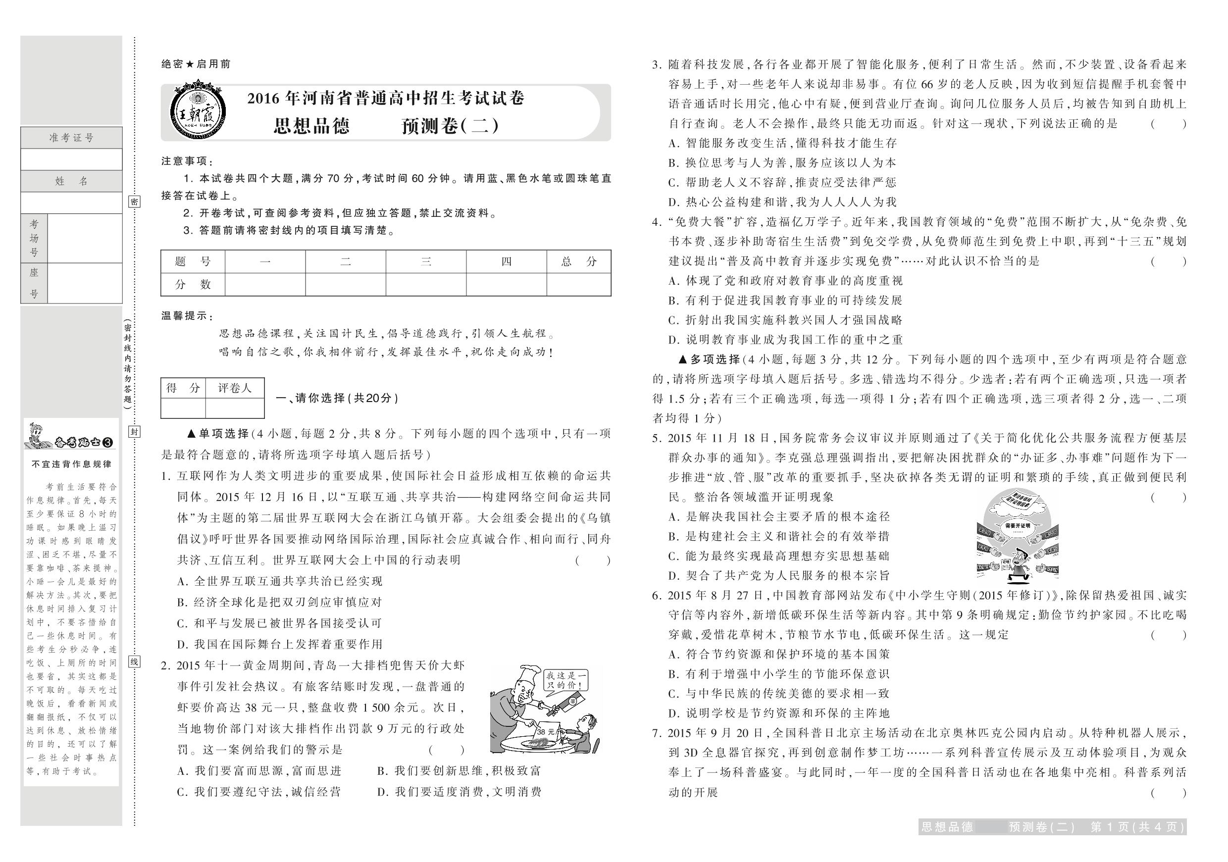 2016年河南省普通高中招生考试试卷思想品德·预测卷(二)