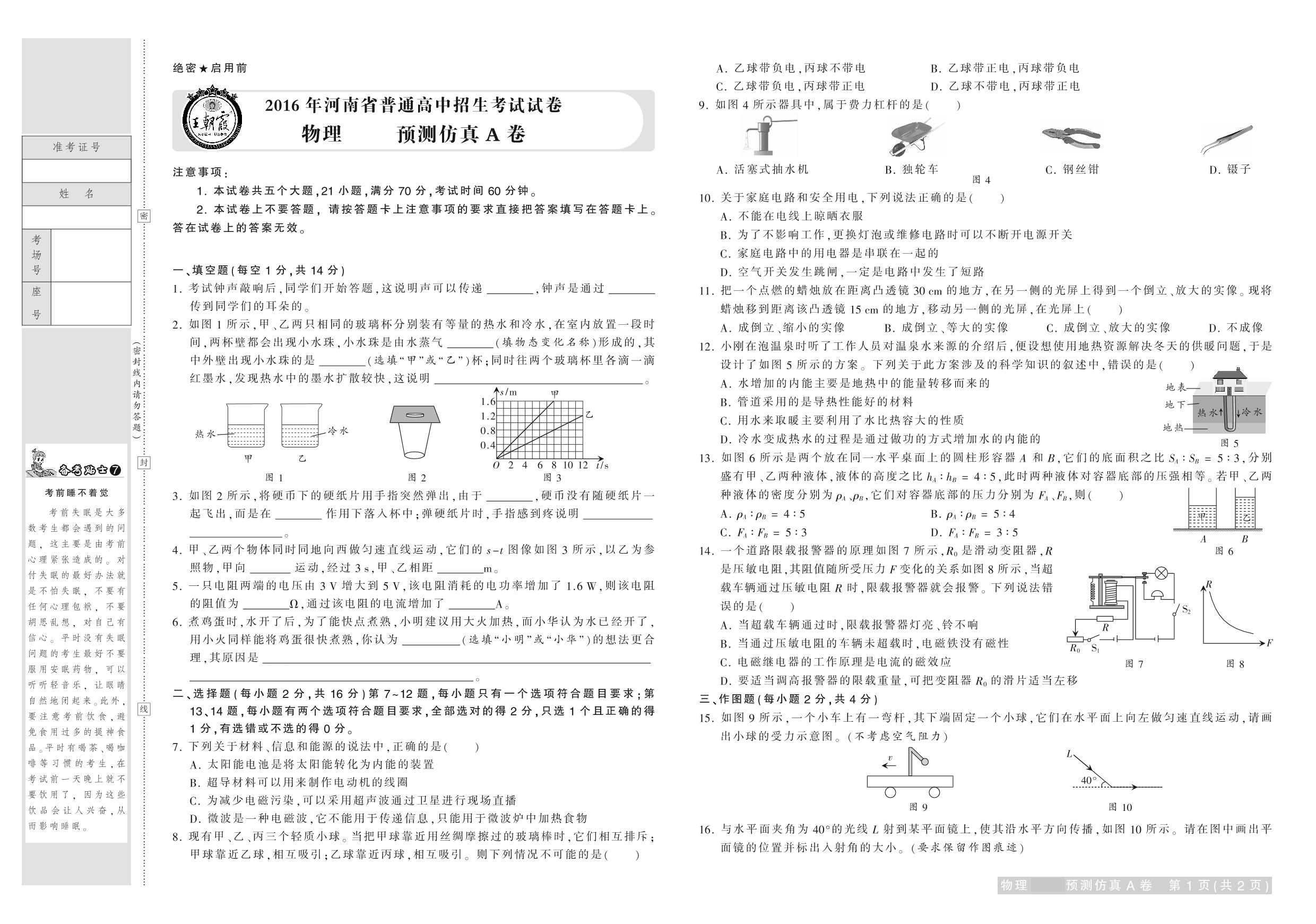 2016年河南省普通高中招生考试试卷物理·预测仿真A卷
