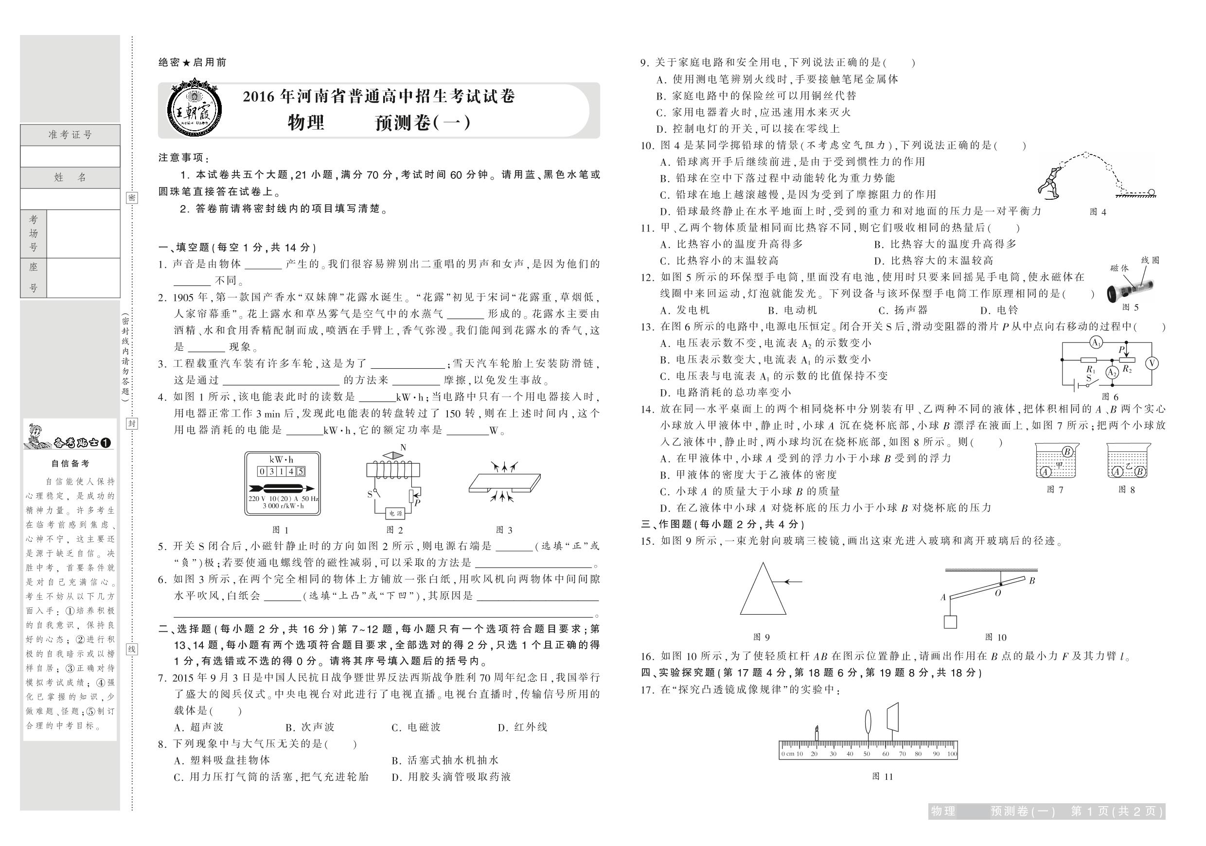 2016年河南省普通高中招生考试试卷物理·预测卷(一)