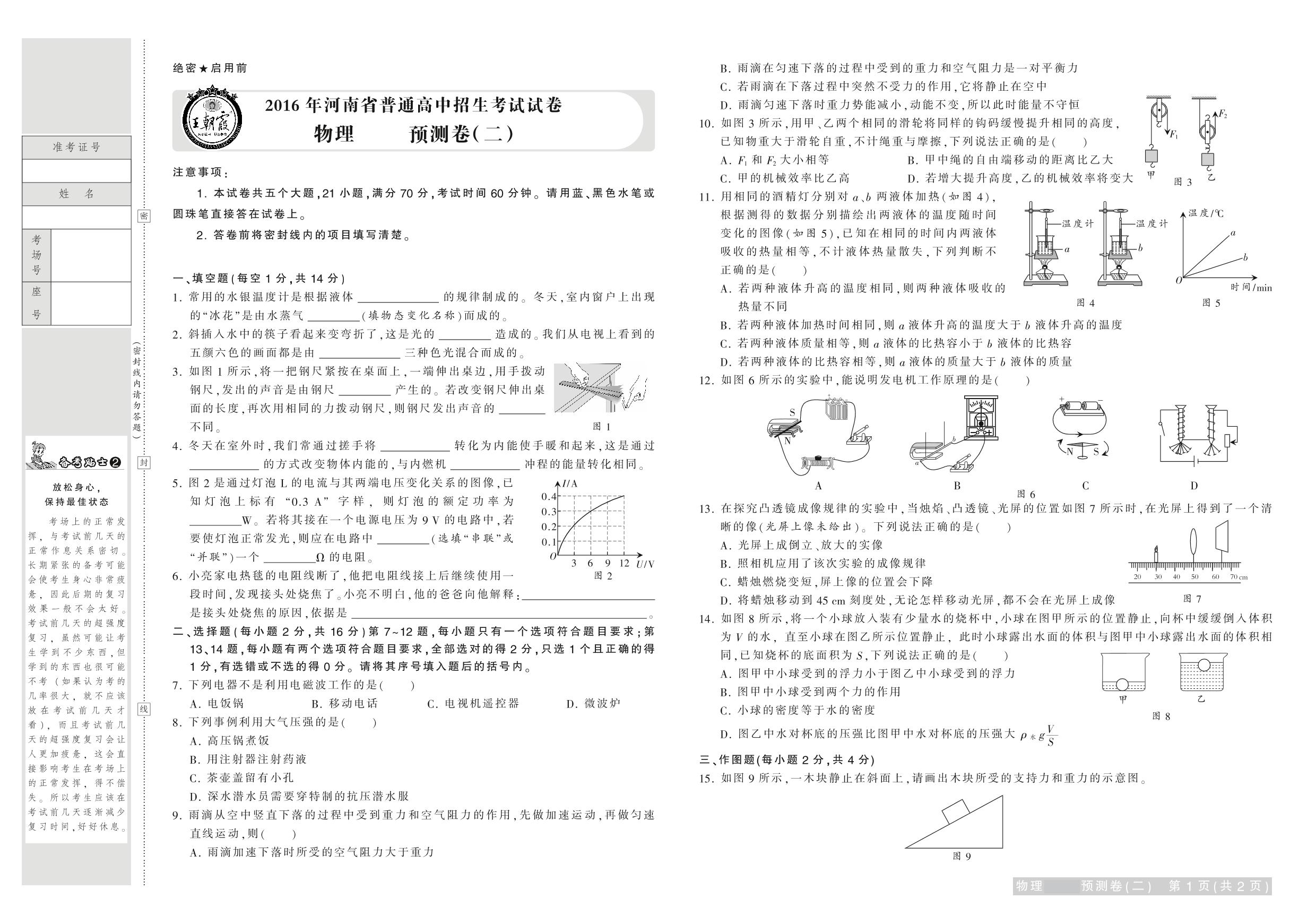 2016年河南省普通高中招生考试试卷物理·预测卷(二)