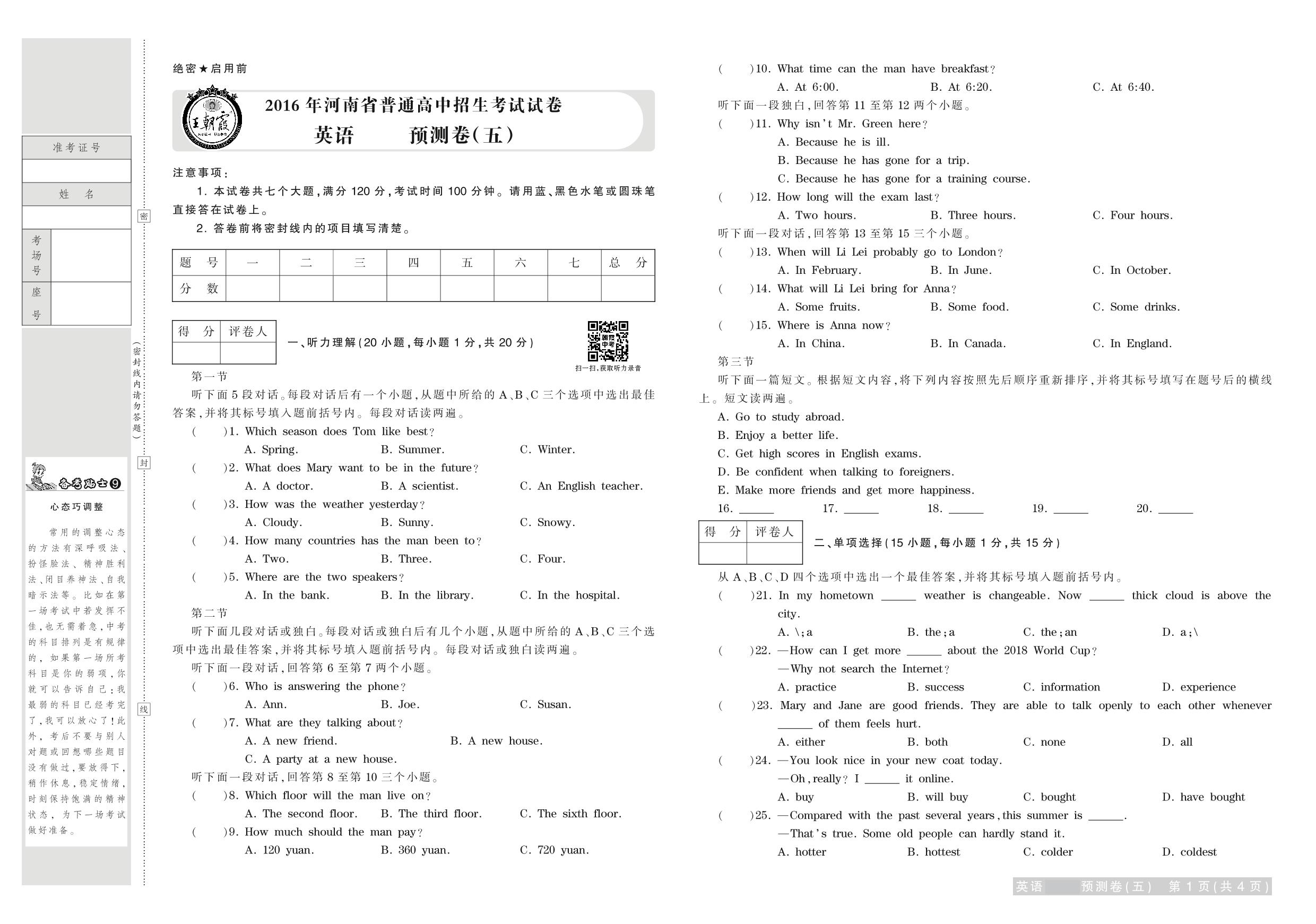 2016年河南省普通高中招生考试试卷英语·预测卷(五)