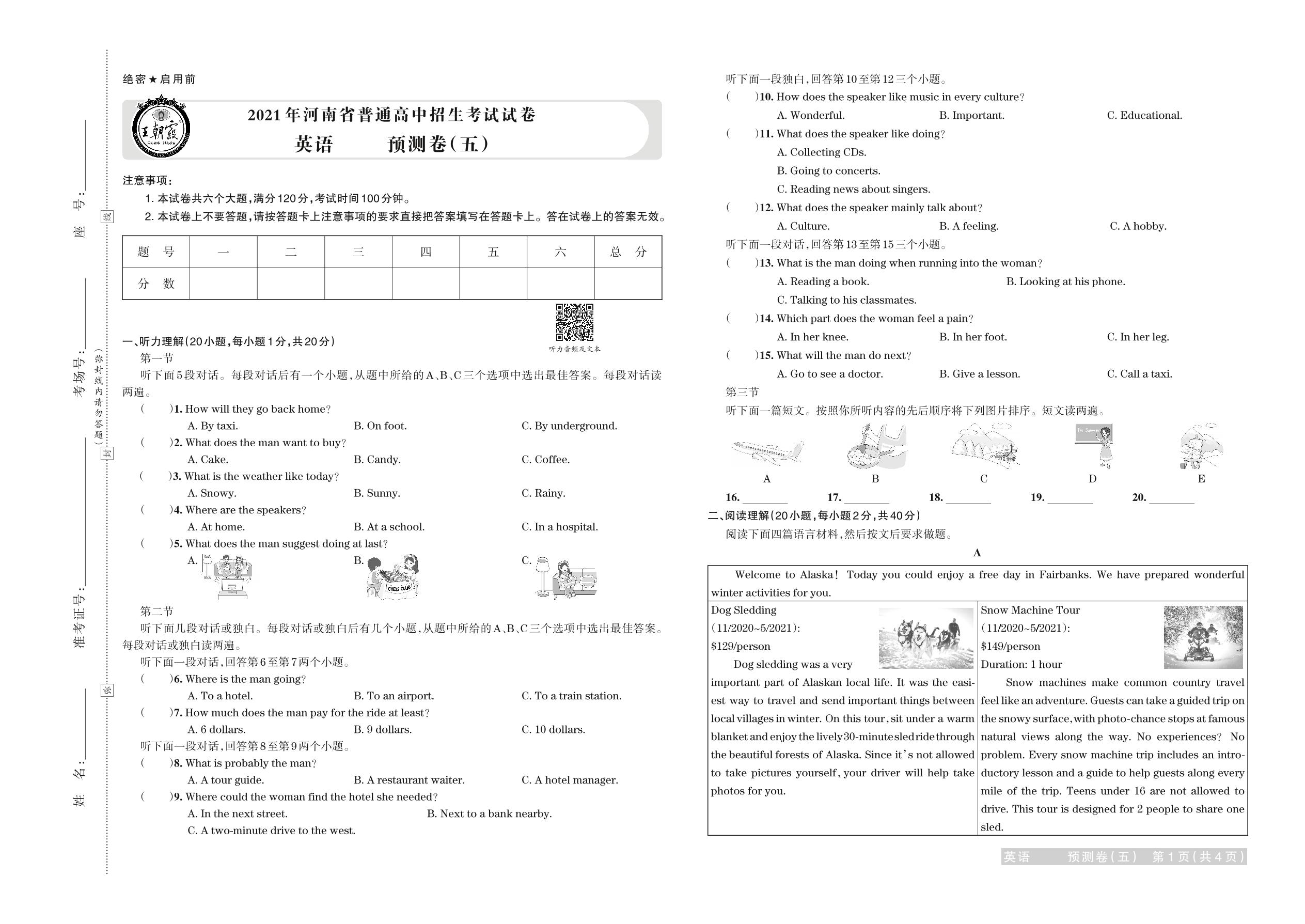 2021年河南省普通高中招生考试试卷英语·预测卷(五)