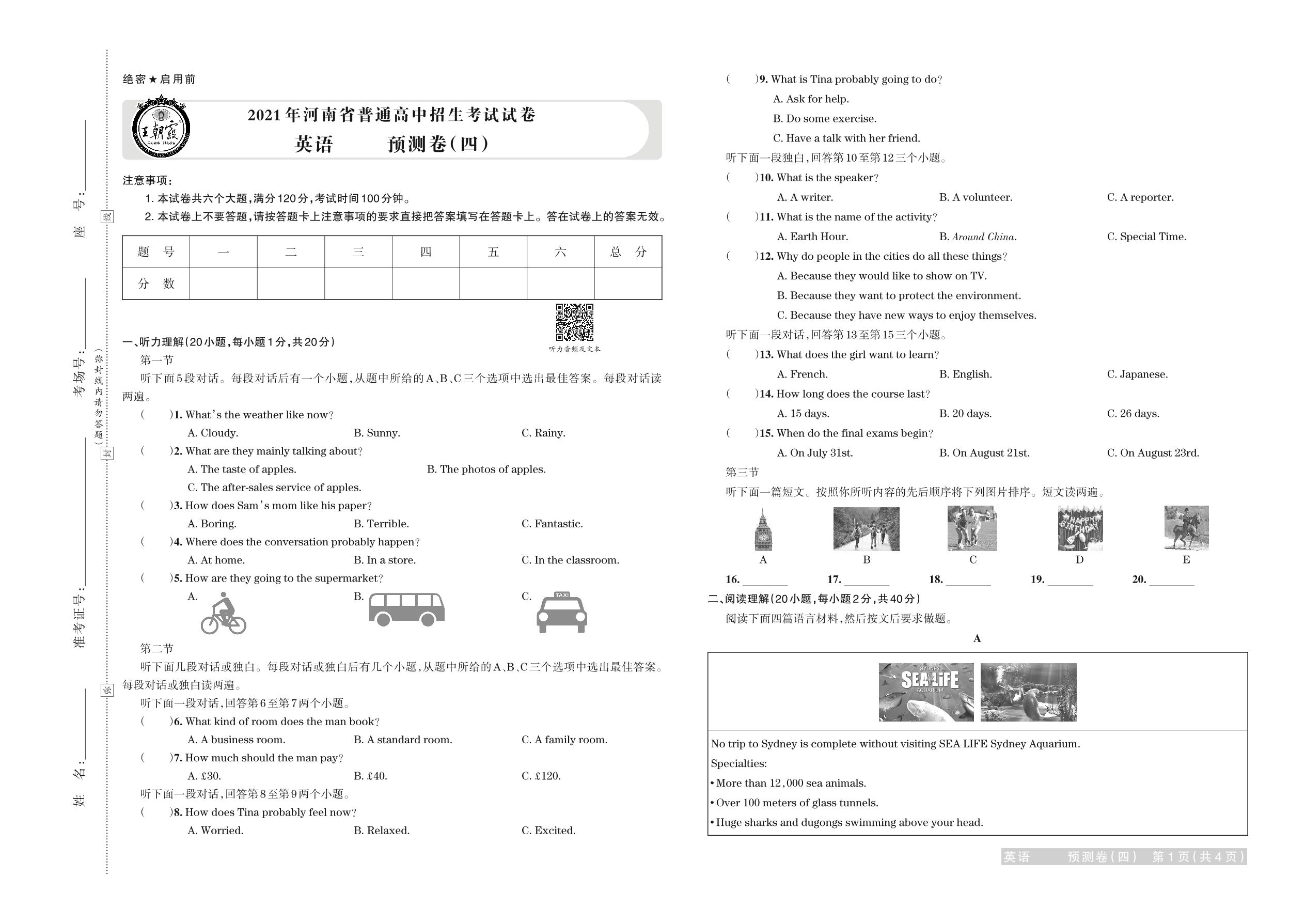 2021年河南省普通高中招生考试试卷英语·预测卷(四)