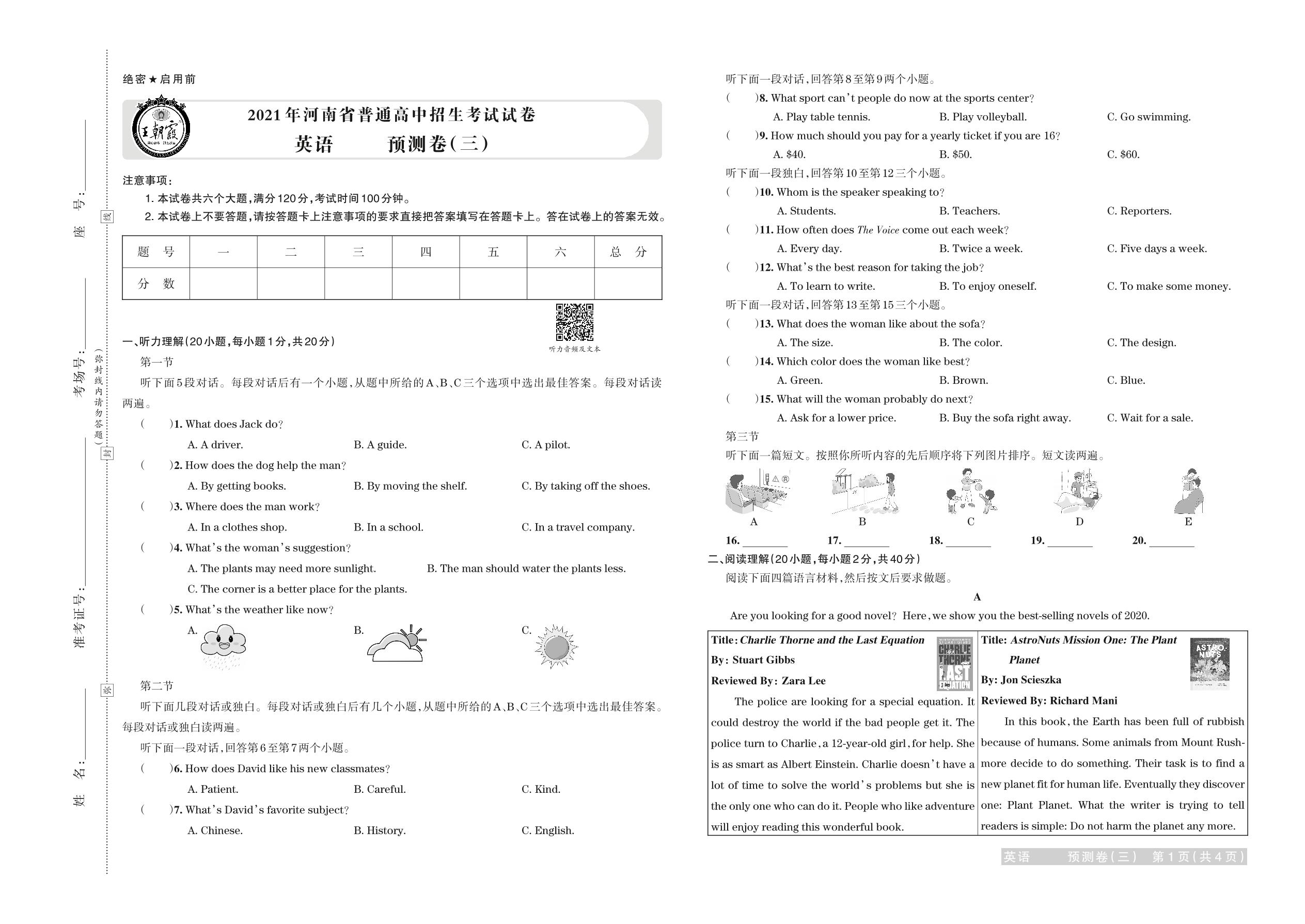 2021年河南省普通高中招生考试试卷英语·预测卷(三)
