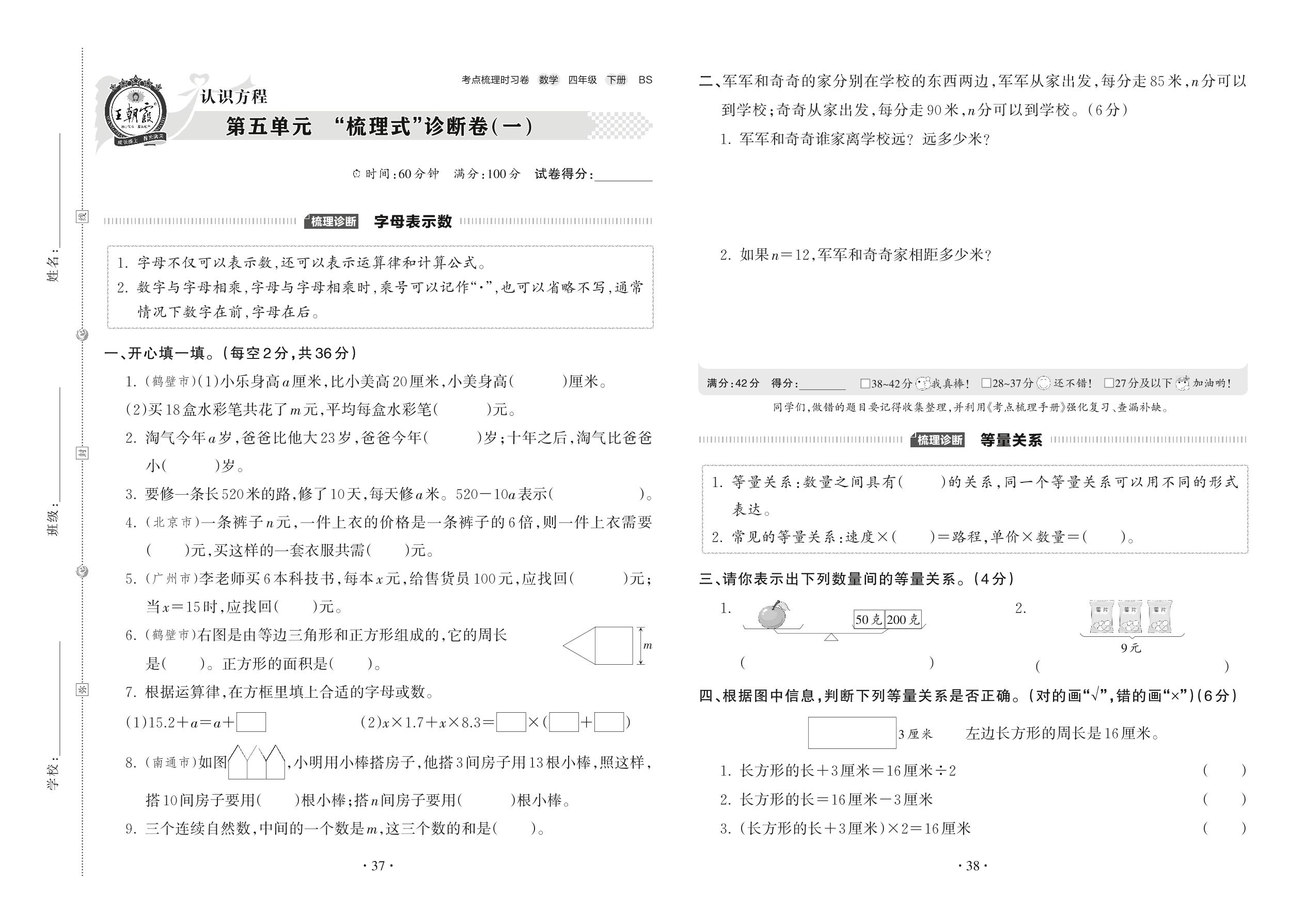 2022下册四年级数学北师版 第五单元 “梳理式”诊断卷(一)