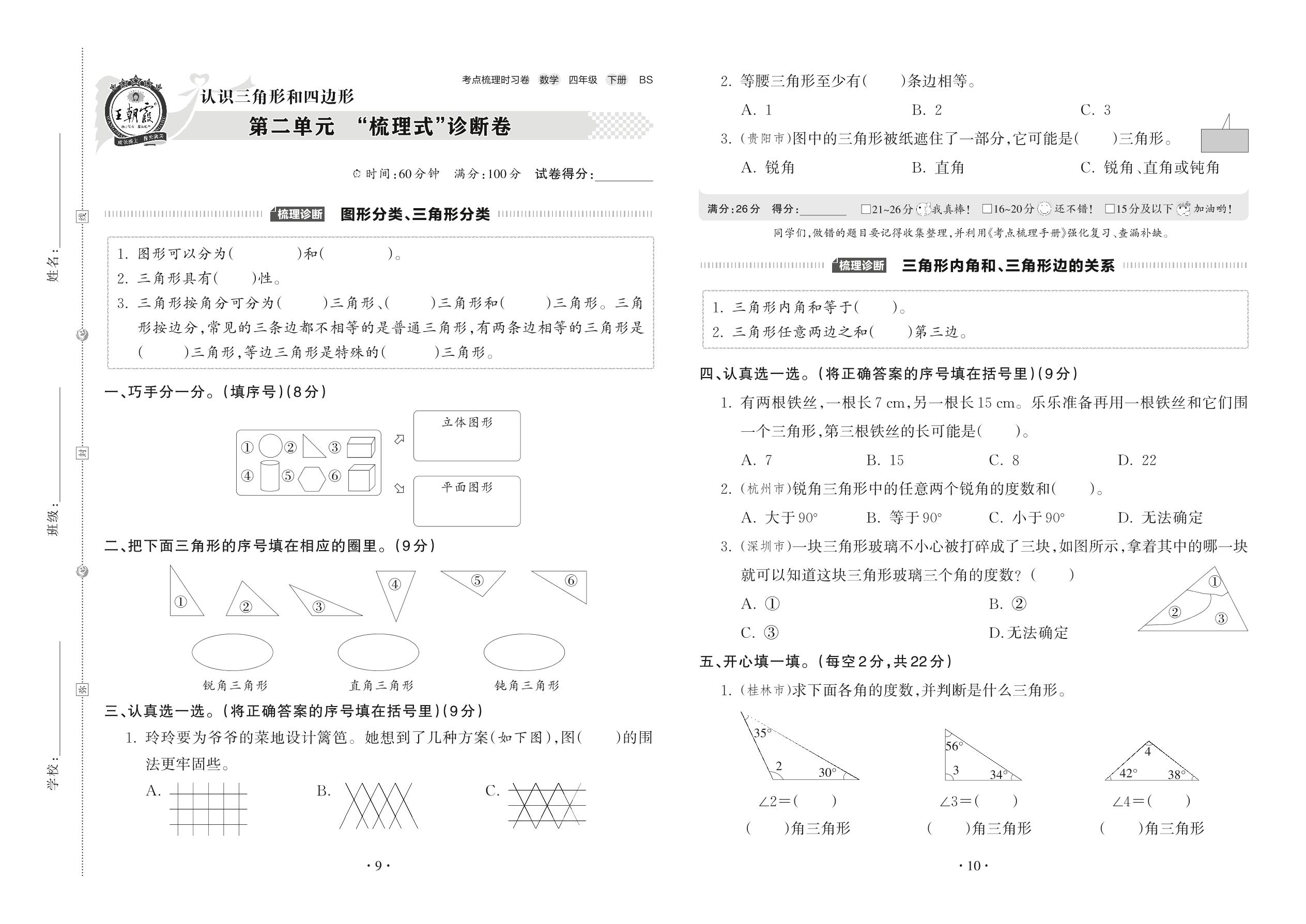 2022下册四年级数学北师版 第二单元 “梳理式”诊断卷