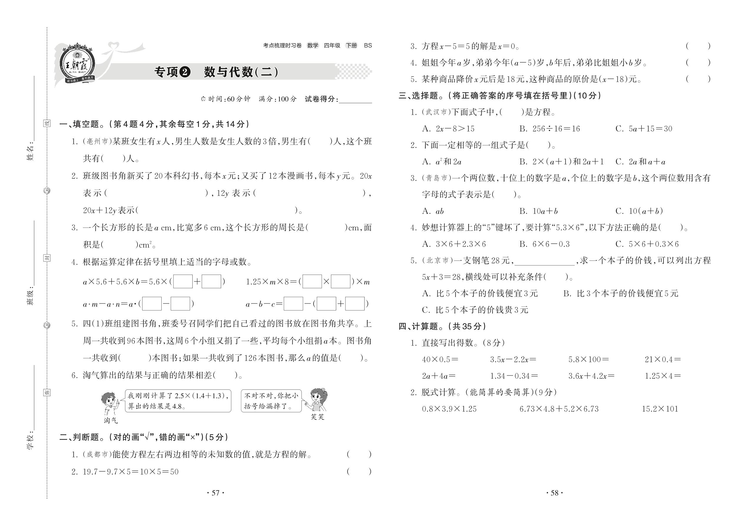 四年级数学北师版下册专项卷