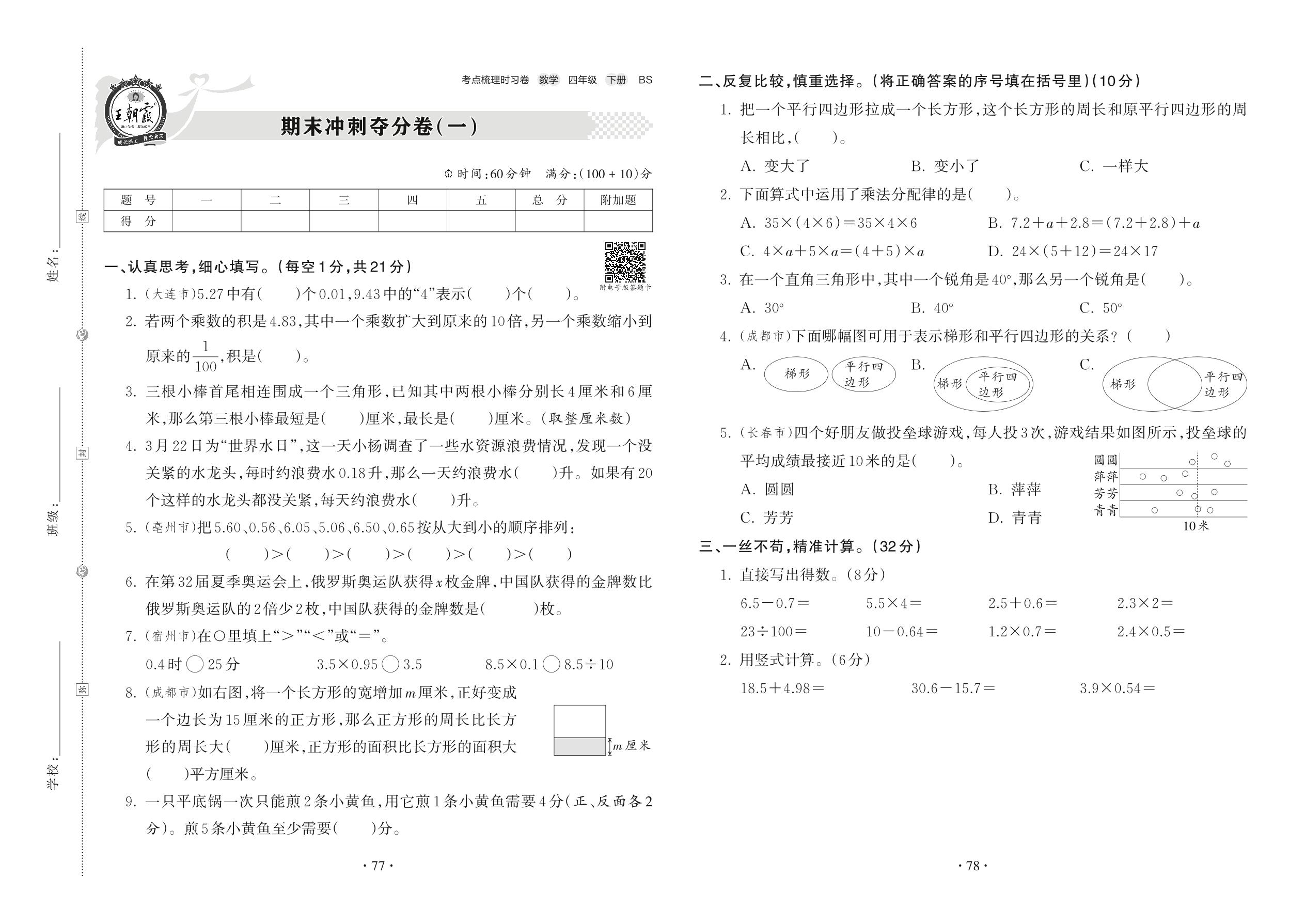 2022下册四年级数学北师版 期末冲刺夺分卷(一)