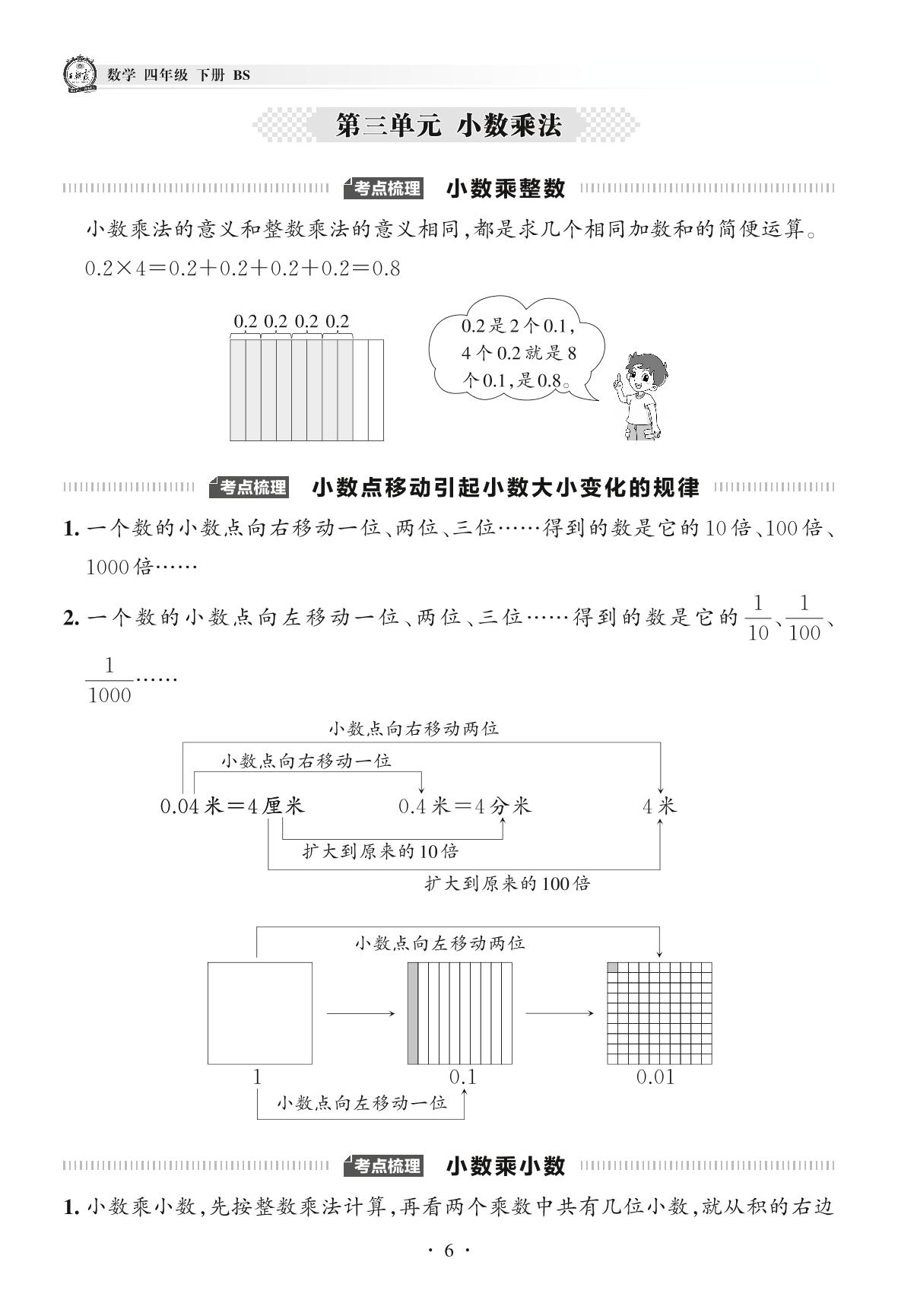 2022下册四年级数学北师版 考点梳理手册——第三单元 小数乘法