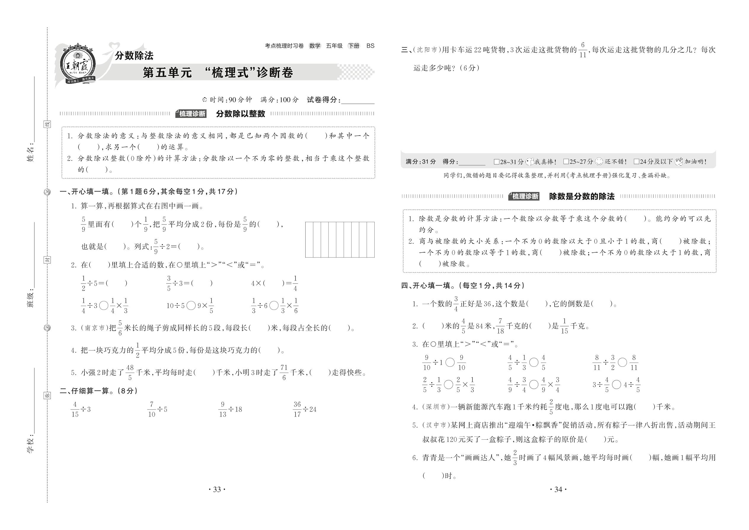 2022下册五年级数学北师版 第五单元 “梳理式”诊断卷