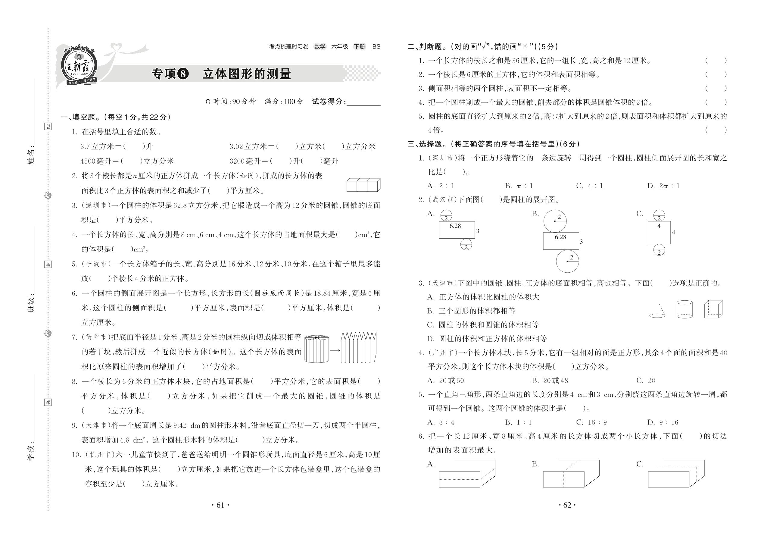 2022下册六年级数学北师版 专项8 立体图形的测量