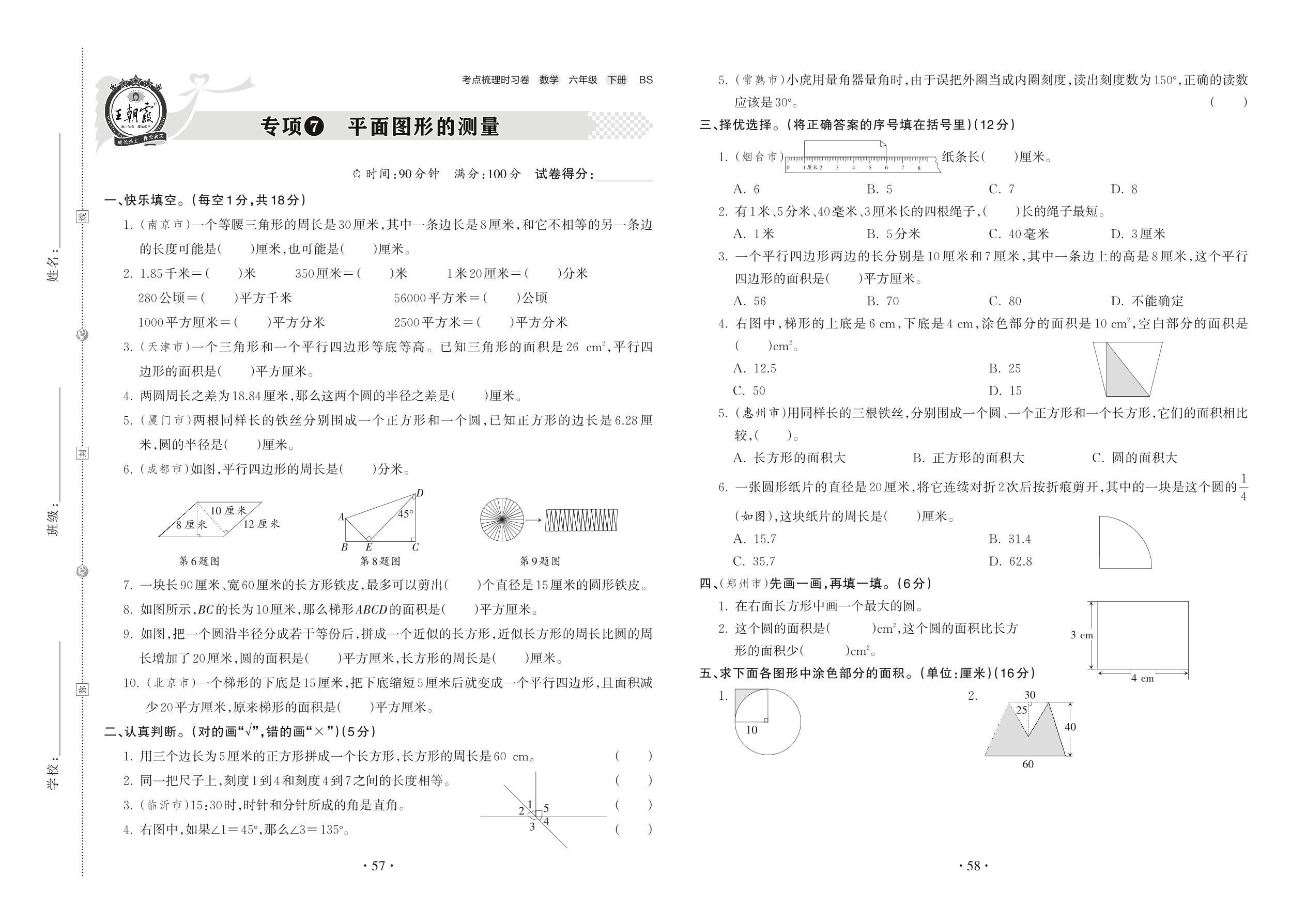 2022下册六年级数学北师版 专项7 平面图形的测量