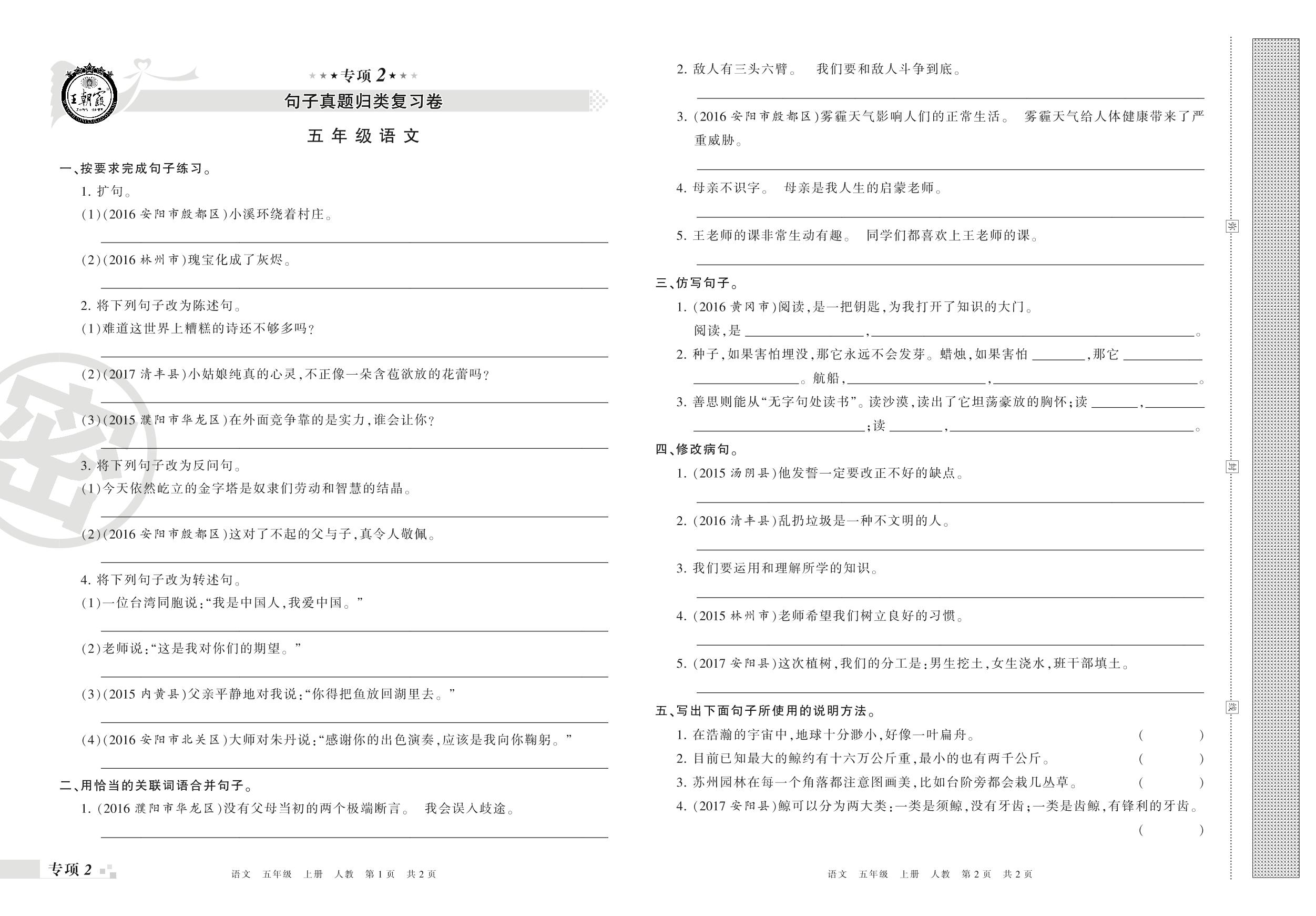 王朝霞期末专项卷——句子真题归类复习五年级上册语文(人教版)【0】