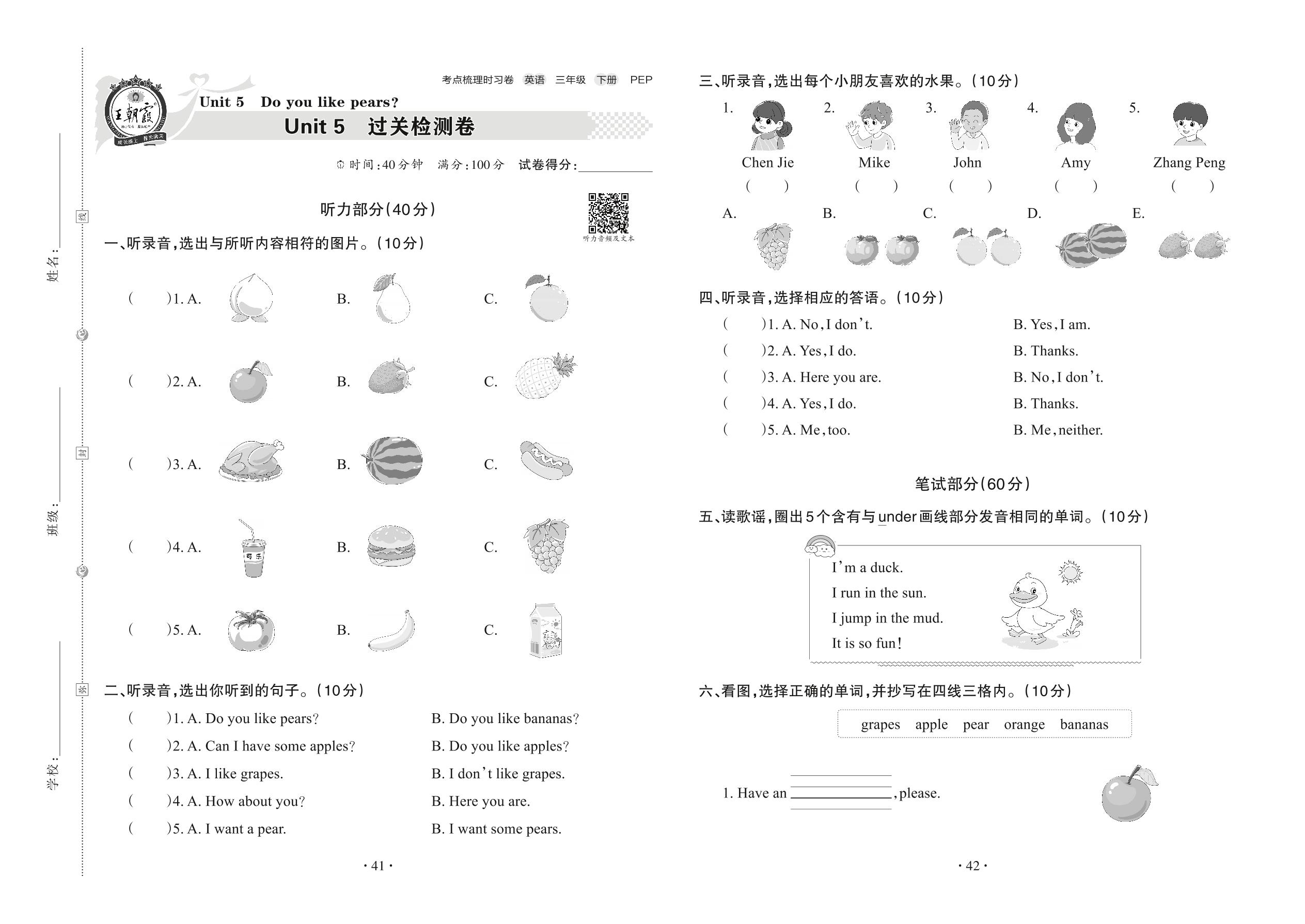2022下册三年级英语人教PEP版 Unit 5 过关检测卷