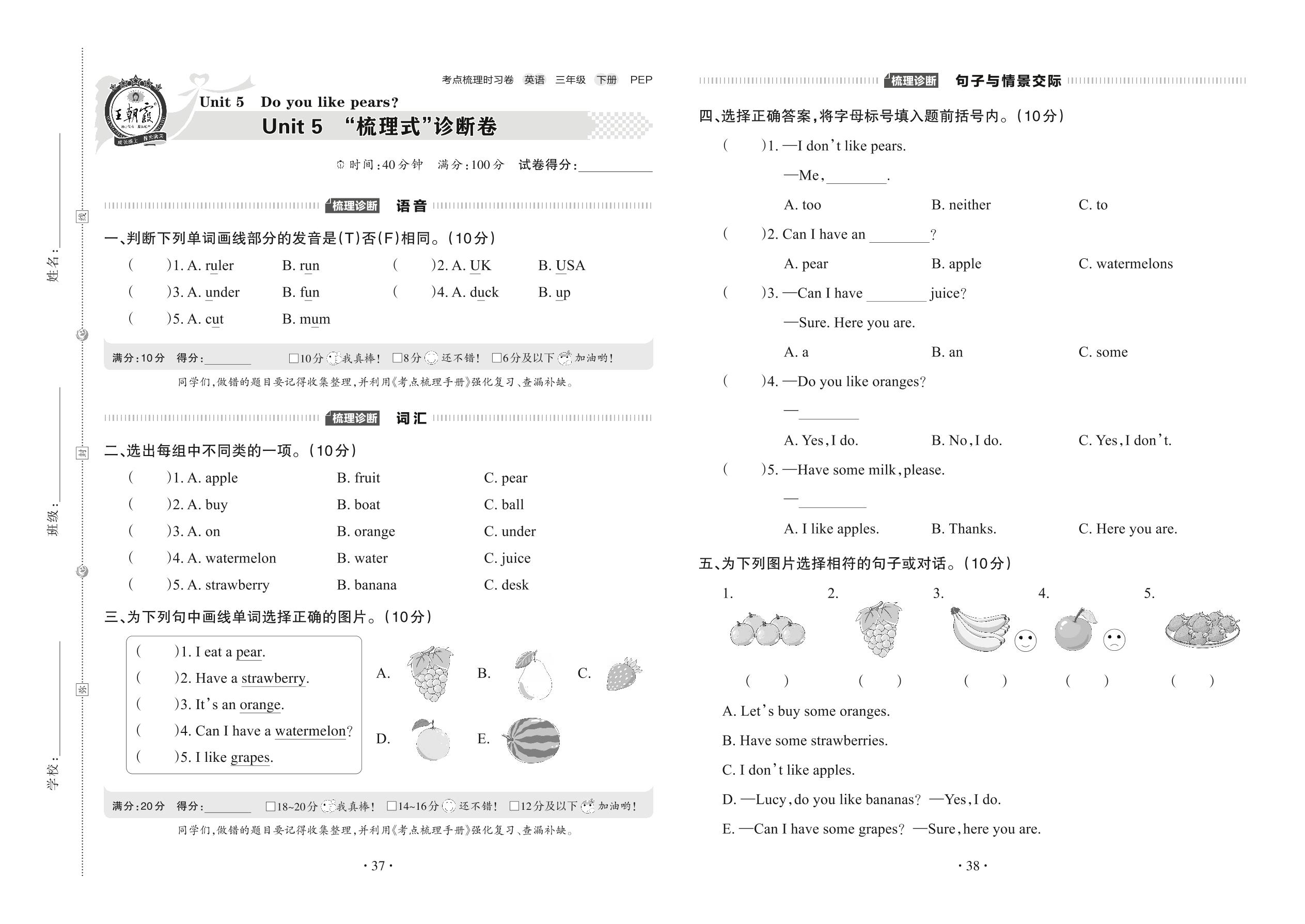 2022下册三年级英语人教PEP版 Unit 5 “梳理式”诊断卷