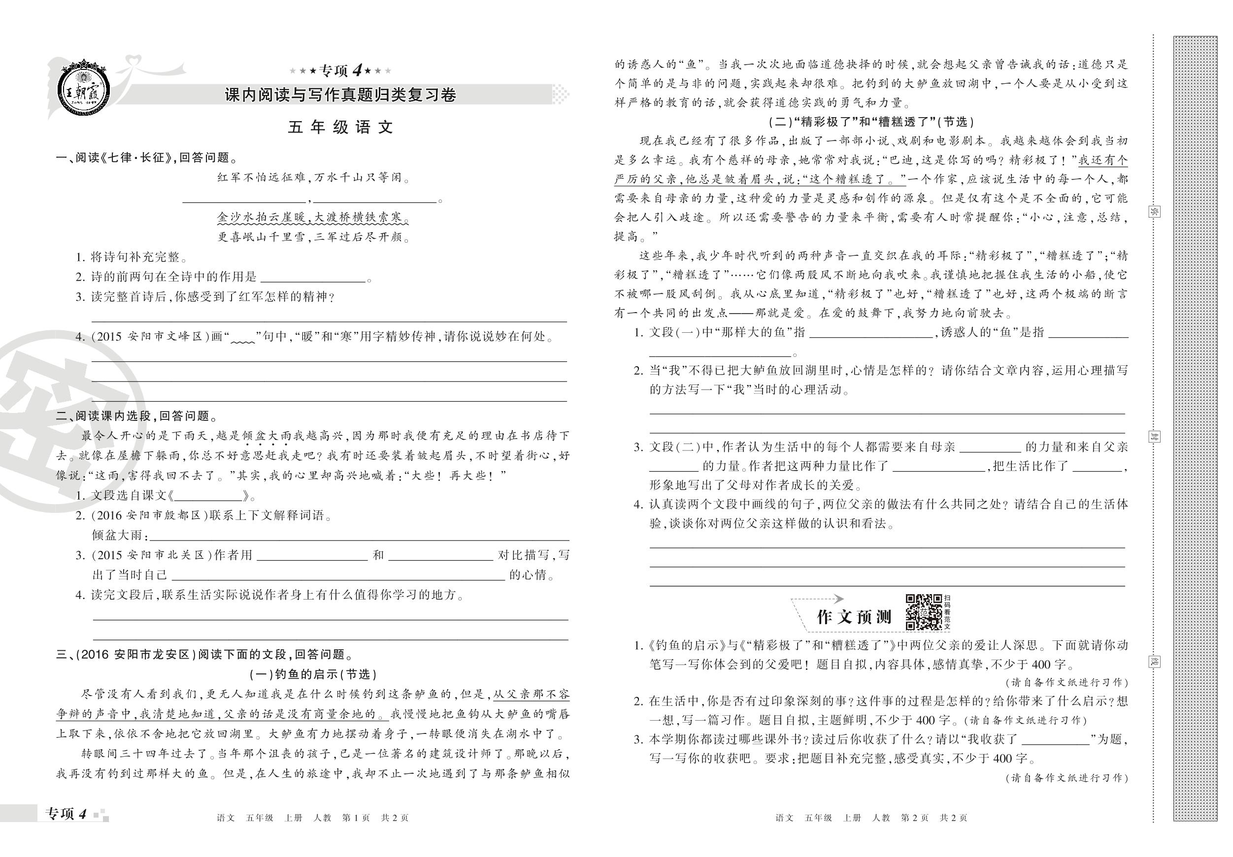 王朝霞期末专项卷——课内阅读与写作真题归类复习五年级上册语文(人教版)【0】