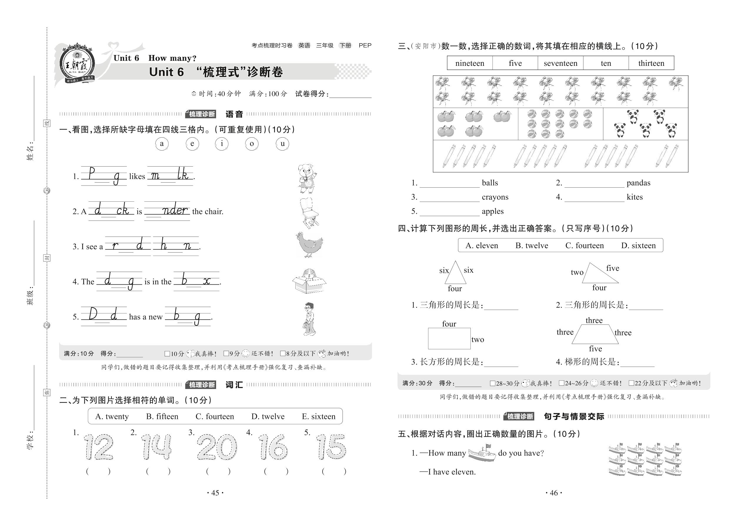 2022下册三年级英语人教PEP版 Unit 6 “梳理式”诊断卷