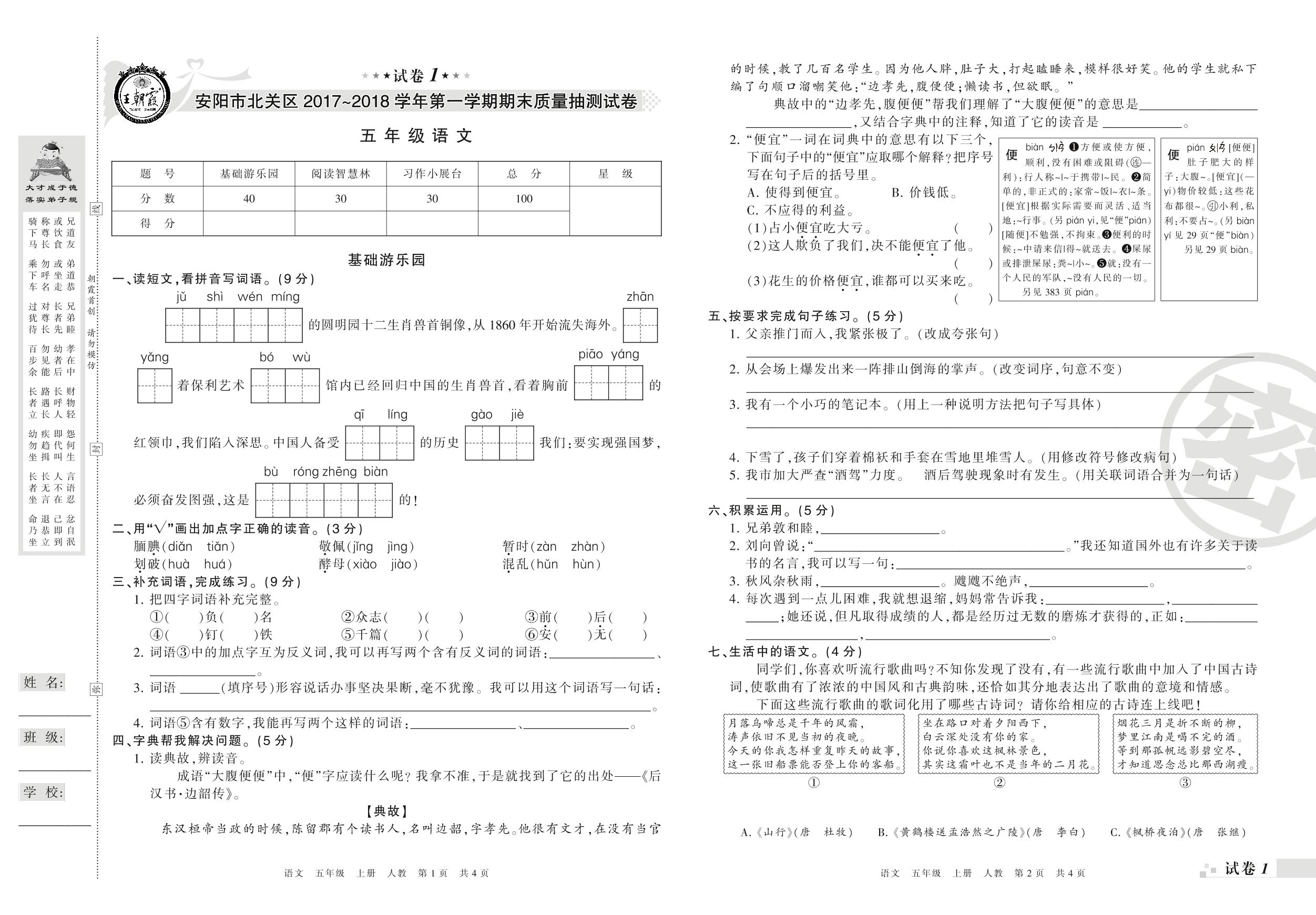 2017-2018学年第一学期安阳市北关区五年级语文试卷(人教版)【1】