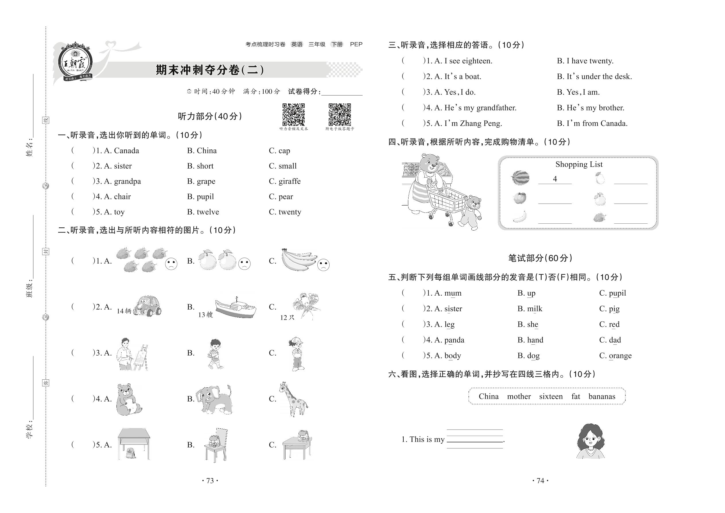 2022下册三年级英语人教PEP版 期末冲刺夺分卷(二)